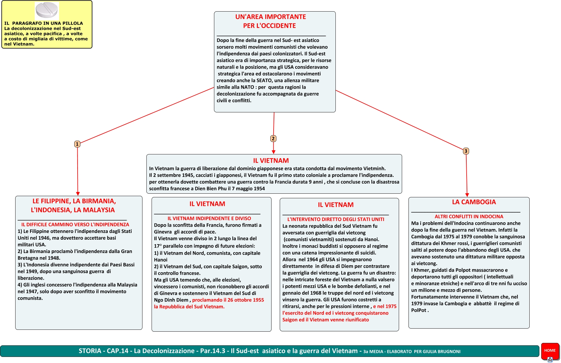 Questa Cmap, creata con IHMC CmapTools, contiene informazioni relative a: STORIA - Par.14.3 - Il Sud-est asiatico e la guerra del Vietnam - GB 3a media, UN'AREA IMPORTANTE PER L'OCCIDENTE ________________________________________ Dopo la fine della guerra nel Sud- est asiatico sorsero molti movimenti comunisti che volevano l'indipendenza dai paesi colonizzatori. Il Sud-est asiatico era di importanza strategica, per le risorse naturali e la posizione, ma gli USA consideravano strategica l'area ed ostacolarono i movimenti creando anche la SEATO, una allenza militare simile alla NATO : per questa ragioni la decolonizzazione fu accompagnata da guerre civili e conflitti. 2 IL VIETNAM In Vietnam la guerra di liberazione dal dominio giapponese era stata condotta dal movimento Vietminh. Il 2 settembre 1945, cacciati i giapponesi, il Vietnam fu il primo stato coloniale a proclamare l'indipendenza. per ottenerla dovette combattere una guerra contro la Francia durata 9 anni , che si concluse con la disastrosa sconfitta francese a Dien Bien Phu il 7 maggio 1954, UN'AREA IMPORTANTE PER L'OCCIDENTE ________________________________________ Dopo la fine della guerra nel Sud- est asiatico sorsero molti movimenti comunisti che volevano l'indipendenza dai paesi colonizzatori. Il Sud-est asiatico era di importanza strategica, per le risorse naturali e la posizione, ma gli USA consideravano strategica l'area ed ostacolarono i movimenti creando anche la SEATO, una allenza militare simile alla NATO : per questa ragioni la decolonizzazione fu accompagnata da guerre civili e conflitti. 1 LE FILIPPINE, LA BIRMANIA, L'INDONESIA, LA MALAYSIA ________________________________________ IL DIFFICILE CAMMINO VERSO L'INDIPENDENZA 1) Le Filippine ottennero l'indipendenza dagli Stati Uniti nel 1946, ma dovettero accettare basi militari USA. 2) La Birmania proclamò l'indipendenza dalla Gran Bretagna nel 1948. 3) L'Indonesia divenne indipendente dai Paesi Bassi nel 1949, dopo una sanguinosa guerra di liberazione. 4) Gli inglesi concessero l'indipendenza alla Malaysia nel 1947, solo dopo aver sconfitto il movimento comunista., UN'AREA IMPORTANTE PER L'OCCIDENTE ________________________________________ Dopo la fine della guerra nel Sud- est asiatico sorsero molti movimenti comunisti che volevano l'indipendenza dai paesi colonizzatori. Il Sud-est asiatico era di importanza strategica, per le risorse naturali e la posizione, ma gli USA consideravano strategica l'area ed ostacolarono i movimenti creando anche la SEATO, una allenza militare simile alla NATO : per questa ragioni la decolonizzazione fu accompagnata da guerre civili e conflitti. 3 LA CAMBOGIA ________________________________________ ALTRI CONFLITTI IN INDOCINA Ma i problemi dell'Indocina continuarono anche dopo la fine della guerra nel Vietnam. Infatti la Cambogia dal 1975 al 1979 conobbe la sanguinosa dittatura dei Khmer rossi, i guerriglieri comunisti saliti al potere dopo l'abbandono degli USA. che avevano sostenuto una dittatura militare opposta ai vietcong. I Khmer, guidati da Polpot massacrarono e deportarono tutti gli oppositori ( intellettuali e minoranze etniche) e nell'arco di tre nni fu ucciso un milione e mezzo di persone. Fortunatamente intervenne il Vietnam che, nel 1979 invase la Cambogia e abbattè il regime di PolPot .