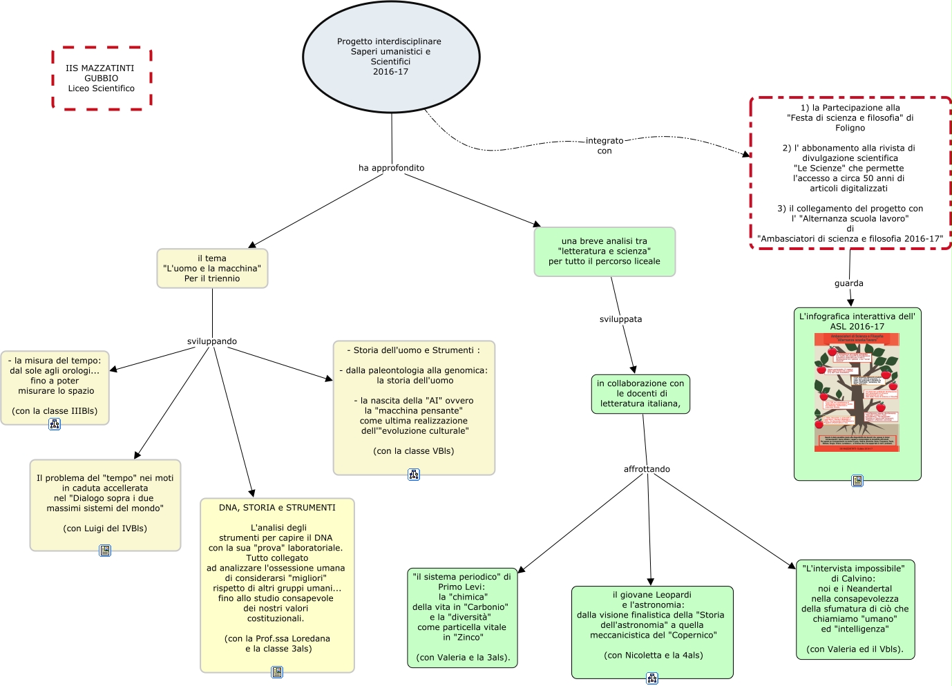 Questa Cmap, creata con IHMC CmapTools, contiene informazioni relative a: Progetto Interdisciplinare 2016-17, Progetto interdisciplinare Saperi umanistici e Scientifici 2016-17 integrato con 1) la Partecipazione alla "Festa di scienza e filosofia" di Foligno 2) l' abbonamento alla rivista di divulgazione scientifica "Le Scienze" che permette l'accesso a circa 50 anni di articoli digitalizzati 3) il collegamento del progetto con l' "Alternanza scuola lavoro" di "Ambasciatori di scienza e filosofia 2016-17", 1) la Partecipazione alla "Festa di scienza e filosofia" di Foligno 2) l' abbonamento alla rivista di divulgazione scientifica "Le Scienze" che permette l'accesso a circa 50 anni di articoli digitalizzati 3) il collegamento del progetto con l' "Alternanza scuola lavoro" di "Ambasciatori di scienza e filosofia 2016-17" guarda L'infografica interattiva dell' ASL 2016-17, in collaborazione con le docenti di letteratura italiana, affrottando il giovane Leopardi e l'astronomia: dalla visione finalistica della "Storia dell'astronomia" a quella meccanicistica del "Copernico" (con Nicoletta e la 4als), Progetto interdisciplinare Saperi umanistici e Scientifici 2016-17 ha approfondito il tema "L'uomo e la macchina" Per il triennio, in collaborazione con le docenti di letteratura italiana, affrottando "L'intervista impossibile" di Calvino: noi e i Neandertal nella consapevolezza della sfumatura di ciò che chiamiamo "umano" ed "intelligenza" (con Valeria ed il Vbls)., Progetto interdisciplinare Saperi umanistici e Scientifici 2016-17 ha approfondito una breve analisi tra "letteratura e scienza" per tutto il percorso liceale, il tema "L'uomo e la macchina" Per il triennio sviluppando Il problema del "tempo" nei moti in caduta accellerata nel "Dialogo sopra i due massimi sistemi del mondo" (con Luigi del IVBls), il tema "L'uomo e la macchina" Per il triennio sviluppando - Storia dell'uomo e Strumenti : - dalla paleontologia alla genomica: la storia dell'uomo - la nascita della "AI" ovvero la "macchina pensante" come ultima realizzazione dell'"evoluzione culturale" (con la classe VBls), il tema "L'uomo e la macchina" Per il triennio sviluppando DNA, STORIA e STRUMENTI L'analisi degli strumenti per capire il DNA con la sua "prova" laboratoriale. Tutto collegato ad analizzare l'ossessione umana di considerarsi "migliori" rispetto di altri gruppi umani... fino allo studio consapevole dei nostri valori costituzionali. (con la Prof.ssa Loredana e la classe 3als), in collaborazione con le docenti di letteratura italiana, affrottando "il sistema periodico" di Primo Levi: la "chimica" della vita in "Carbonio" e la "diversità" come particella vitale in "Zinco" (con Valeria e la 3als)., una breve analisi tra "letteratura e scienza" per tutto il percorso liceale sviluppata in collaborazione con le docenti di letteratura italiana,, il tema "L'uomo e la macchina" Per il triennio sviluppando - la misura del tempo: dal sole agli orologi... fino a poter misurare lo spazio (con la classe IIIBls)