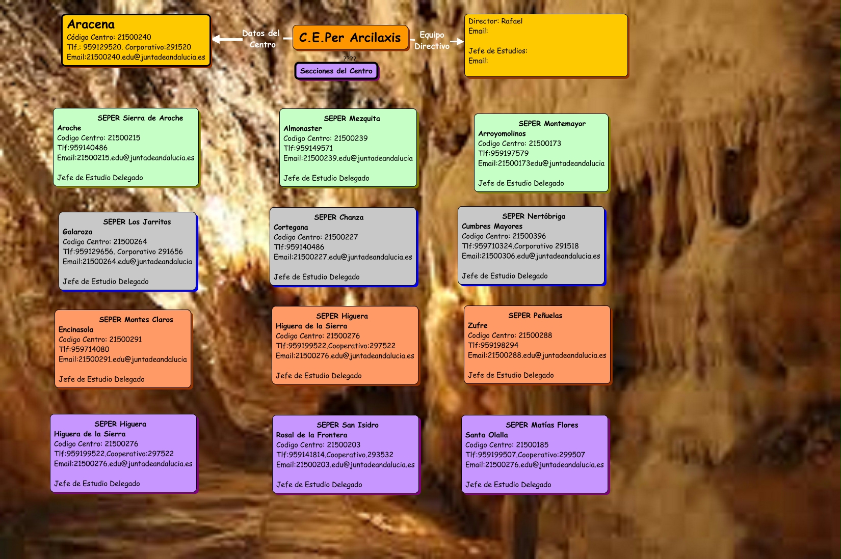 Este Cmap, tiene información relacionada con: CEPer Arcilaxis, C.E.Per Arcilaxis Datos del Centro Aracena Código Centro: 21500240 Tlf.: 959129520. Corporativo:291520 Email:21500240.edu@juntadeandalucia.es, C.E.Per Arcilaxis ???? Secciones del Centro, C.E.Per Arcilaxis Equipo Directivo Director: Rafael Email: Jefe de Estudios: Email: