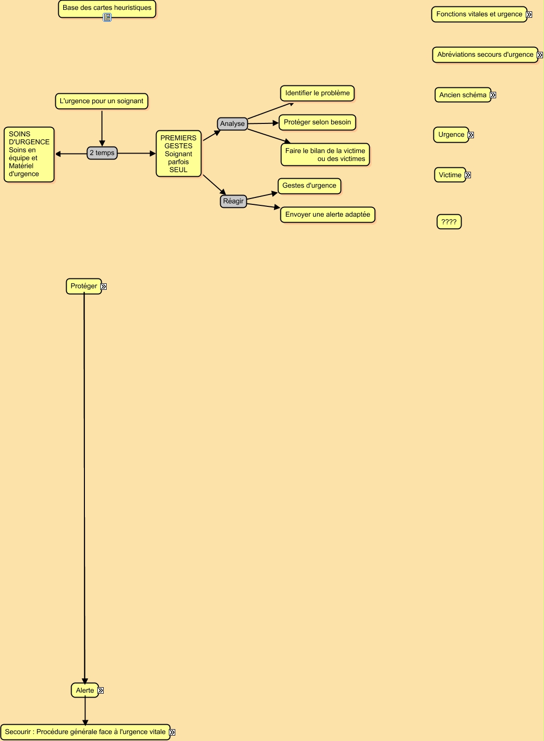 Cette carte de concepts créée avec IHMC CmapTools traite de: AFGSUII-GesteDeSecoursEtDUrgence, PREMIERS GESTES Soignant parfois SEUL Réagir Envoyer une alerte adaptée, Oui Ventilation au ballon 10 par minute Récupérer le chariot d'urgence, Terre Soustraction Risquée, Oui Contact Peau ou muqueuse, Bilan de ou des victimes Bilan Gestes réalisés & efficacité, Non Risques généraux Terre, Arrêt cardio respiratoire de l'adulte Cause Souvent cardiaque, Oui Donner cinq claques énergiques entre les homoplates Reprise de la toux et de la parole, Feux Soustraction Possible, Non Signes de vie ? Non, Examen de la victime Saigne-t-elle ? Oui, Non Risque pour la victime de suraccident ? Non, Pas d'urgence vitale sans victime Tranche d'âge 0-1 ans Nourrisson, Point de compression ou garrot noter l'heure Surveiller son efficacité, Non Respire-t-elle ? Non, Risquée Alerter ou faire alerter Identification, Non Risques généraux Mer, Non Est-elle consciente ? Non, Non Besoin d'aide Alerte passée Victime signalée Risque de suraccident Coordonnées lieux Coordonnées du secouriste, Alerte passée Victime signalée Risque de suraccident Coordonnées lieux Coordonnées du secouriste Non Pas d'intervention