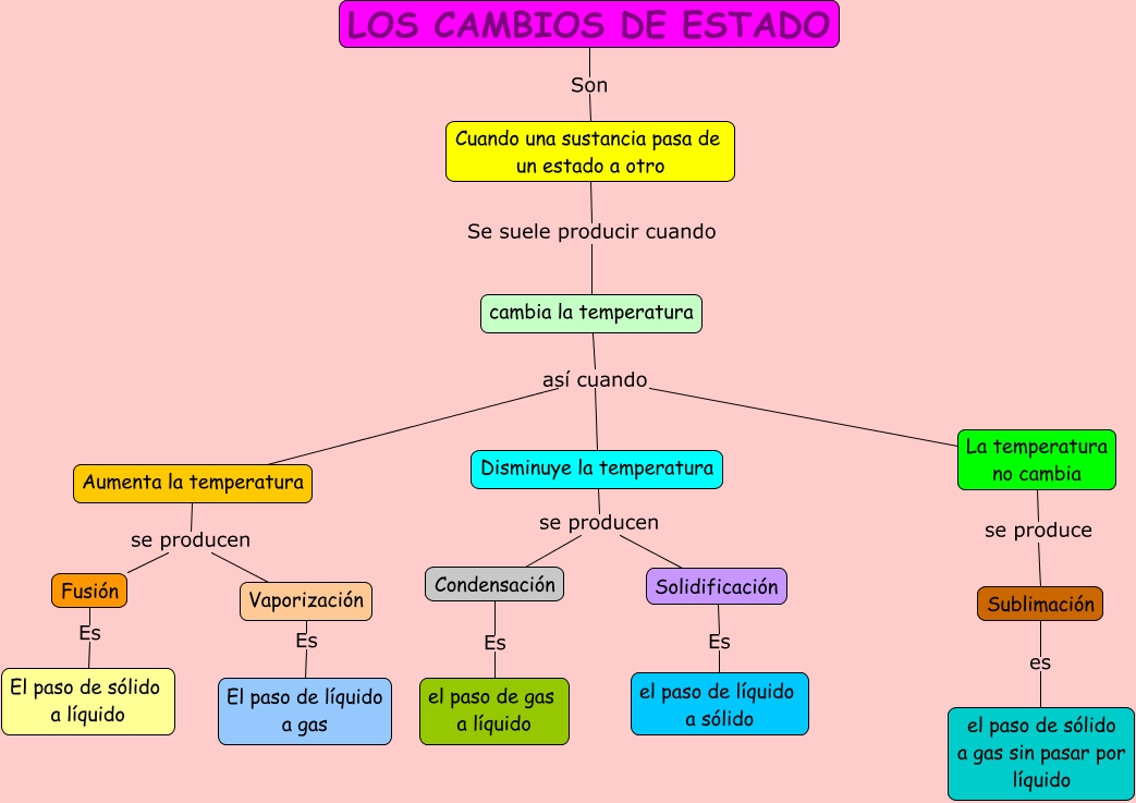Este Cmap, tiene información relacionada con: Los cambios de estado, Disminuye la temperatura se producen Condensación, Solidificación Es el paso de líquido a sólido, LOS CAMBIOS DE ESTADO Son Cuando una sustancia pasa de un estado a otro, Disminuye la temperatura se producen Solidificación, Aumenta la temperatura se producen Fusión, cambia la temperatura así cuando Disminuye la temperatura, Sublimación es el paso de sólido a gas sin pasar por líquido, Condensación Es el paso de gas a líquido, cambia la temperatura así cuando La temperatura no cambia, cambia la temperatura así cuando Aumenta la temperatura, Vaporización Es El paso de líquido a gas, Fusión Es El paso de sólido a líquido, Cuando una sustancia pasa de un estado a otro Se suele producir cuando cambia la temperatura, La temperatura no cambia se produce Sublimación, Aumenta la temperatura se producen Vaporización