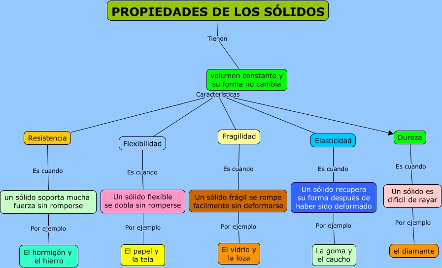 Este Cmap, tiene información relacionada con: La propiedades de los sólidos, volumen constante y su forma no cambia Características Flexibilidad, PROPIEDADES DE LOS SÓLIDOS Tienen volumen constante y su forma no cambia, un sólido soporta mucha fuerza sin romperse Por ejemplo El hormigón y el hierro, volumen constante y su forma no cambia Características Dureza, volumen constante y su forma no cambia Características Resistencia, Dureza Es cuando Un sólido es difícil de rayar, Resistencia Es cuando un sólido soporta mucha fuerza sin romperse, volumen constante y su forma no cambia Características Fragilidad, Flexibilidad Es cuando Un sólido flexible se dobla sin romperse, Un sólido recupera su forma después de haber sido deformado Por ejemplo La goma y el caucho, Fragilidad Es cuando Un sólido frágil se rompe facilmente sin deformarse, Un sólido frágil se rompe facilmente sin deformarse Por ejemplo El vidrio y la loza, Elasticidad Es cuando Un sólido recupera su forma después de haber sido deformado, volumen constante y su forma no cambia Características Elasticidad, Un sólido es difícil de rayar Por ejemplo el diamante, Un sólido flexible se dobla sin romperse Por ejemplo El papel y la tela