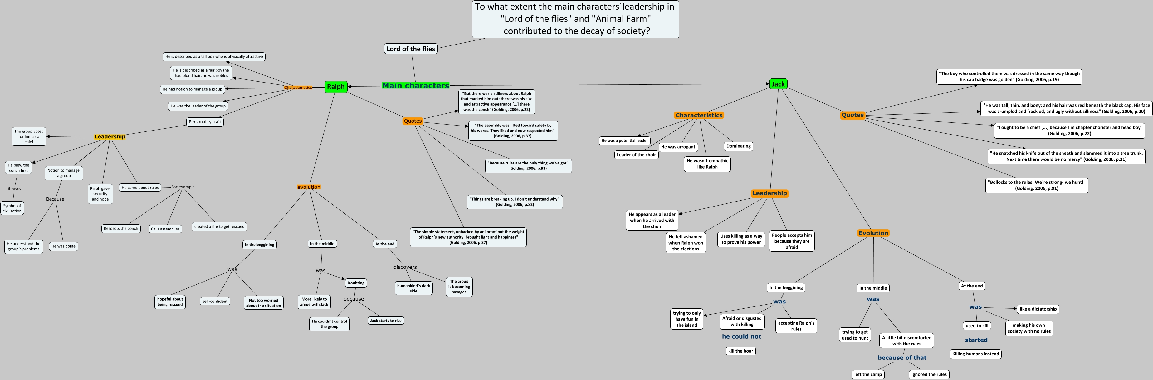Este Cmap, tiene información relacionada con: Mapa mental, Personality trait Leadership He blew the conch first, Personality trait Leadership The group voted for him as a chief, At the end discovers The group is becoming savages, Ralph Quotes "The simple statement, unbacked by ani proof but the weight of Ralph´s new authority, brought light and happiness" (Golding, 2006, p.37), Jack Evolution In the beggining, Ralph evolution At the end, At the end discovers humankind´s dark side, Ralph Quotes "Because rules are the only thing we´ve got" Golding, 2006, p.91), He cared about rules For example Respects the conch, Jack Evolution In the middle, Personality trait Leadership Ralph gave security and hope, In the beggining was Afraid or disgusted with killing, Notion to manage a group Because He understood the group´s problems, In the middle was Doubting, Personality trait Leadership Notion to manage a group, At the end was used to kill, At the end was like a dictatorship, Jack Characteristics He was a potential leader, Doubting because He couldn´t control the group, Jack Quotes "He was tall, thin, and bony; and his hair was red beneath the black cap. His face was crumpled and freckled, and ugly without silliness" (Golding, 2006, p.20)