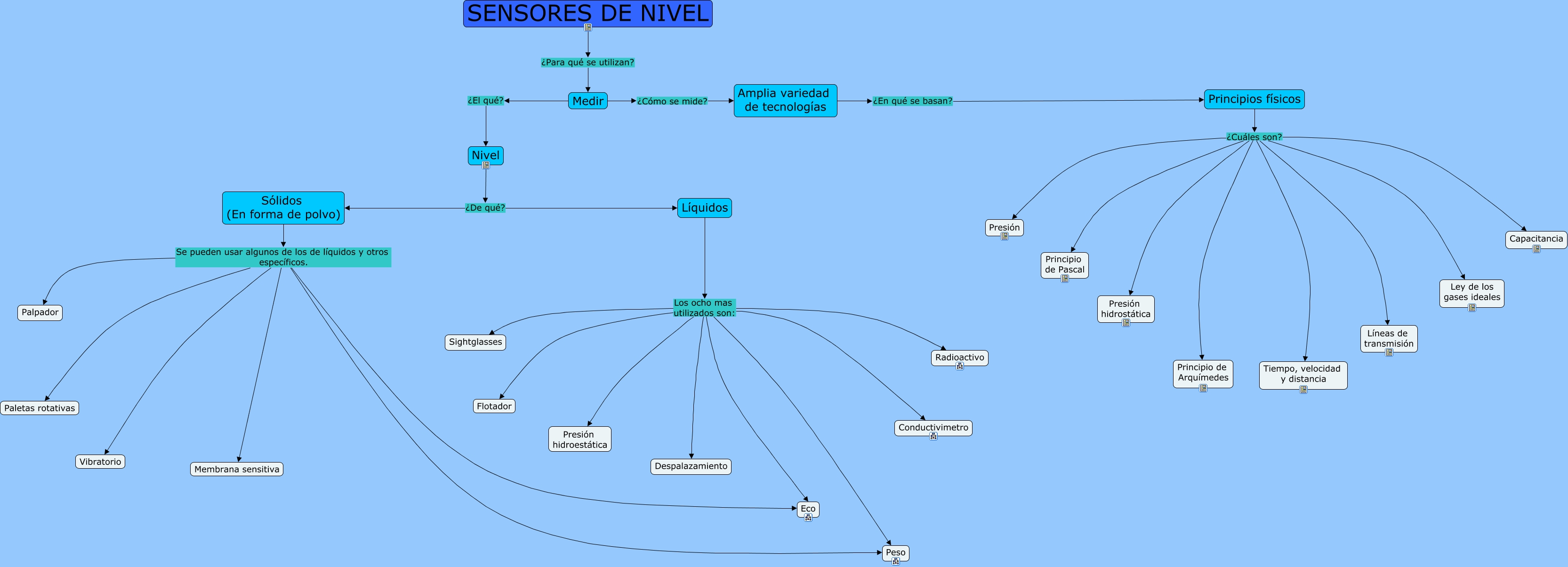 Este Cmap, tiene información relacionada con: NIVEL, Nivel ¿De qué? Sólidos (En forma de polvo), Líquidos Los ocho mas utilizados son: Presión hidroestática, Líquidos Los ocho mas utilizados son: Despalazamiento, Medir ¿Cómo se mide? Amplia variedad de tecnologías, Sólidos (En forma de polvo) Se pueden usar algunos de los de líquidos y otros específicos. Peso, Principios físicos ¿Cuáles son? Presión hidrostática, Líquidos Los ocho mas utilizados son: Conductivimetro, SENSORES DE NIVEL ¿Para qué se utilizan? Medir, Amplia variedad de tecnologías ¿En qué se basan? Principios físicos, Sólidos (En forma de polvo) Se pueden usar algunos de los de líquidos y otros específicos. Palpador, Principios físicos ¿Cuáles son? Capacitancia, Sólidos (En forma de polvo) Se pueden usar algunos de los de líquidos y otros específicos. Paletas rotativas, Principios físicos ¿Cuáles son? Tiempo, velocidad y distancia, Líquidos Los ocho mas utilizados son: Radioactivo, Principios físicos ¿Cuáles son? Principio de Pascal, Sólidos (En forma de polvo) Se pueden usar algunos de los de líquidos y otros específicos. Eco, Líquidos Los ocho mas utilizados son: Eco, Líquidos Los ocho mas utilizados son: Peso, Principios físicos ¿Cuáles son? Presión, Principios físicos ¿Cuáles son? Principio de Arquímedes