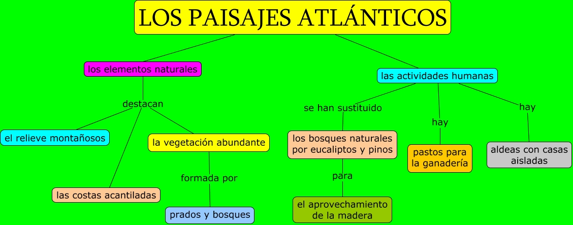 Este Cmap, tiene información relacionada con: Los paisajes atlánticos, la vegetación abundante formada por prados y bosques, las actividades humanas se han sustituido los bosques naturales por eucaliptos y pinos, los elementos naturales destacan las costas acantiladas, LOS PAISAJES ATLÁNTICOS las actividades humanas, los elementos naturales destacan la vegetación abundante, los elementos naturales destacan el relieve montañosos, LOS PAISAJES ATLÁNTICOS los elementos naturales, las actividades humanas hay pastos para la ganadería, los bosques naturales por eucaliptos y pinos para el aprovechamiento de la madera, las actividades humanas hay aldeas con casas aisladas
