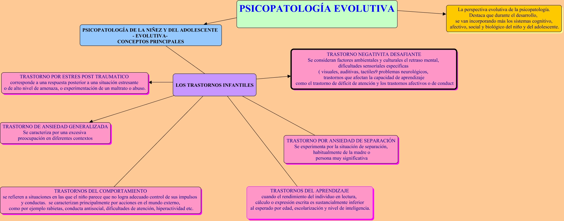 Este Cmap, tiene información relacionada con: TRASTORNOS DE INFANCIA Y ADOLECENCIA, PSICOPATOLOGÍA DE LA NIÑEZ Y DEL ADOLESCENTE - EVOLUTIVA- CONCEPTOS PRINCIPALES ???? TRASTORNOS DEL APRENDIZAJE cuando el rendimiento del individuo en lectura, cálculo o expresión escrita es sustancialmente inferior al esperado por edad, escolarización y nivel de inteligencia., PSICOPATOLOGÍA DE LA NIÑEZ Y DEL ADOLESCENTE - EVOLUTIVA- CONCEPTOS PRINCIPALES ???? TRASTORNO NEGATIVITA DESAFIANTE Se consideran factores ambientales y culturales el retraso mental, dificultades sensoriales especificas ( visuales, auditivas, tactiles9 problemas neurológicos, trastornos que afectan la capacidad de aprendizaje como el trastorno de déficit de atención y los trastornos afectivos o de conduct, PSICOPATOLOGÍA EVOLUTIVA ???? PSICOPATOLOGÍA DE LA NIÑEZ Y DEL ADOLESCENTE - EVOLUTIVA- CONCEPTOS PRINCIPALES, PSICOPATOLOGÍA DE LA NIÑEZ Y DEL ADOLESCENTE - EVOLUTIVA- CONCEPTOS PRINCIPALES ???? TRASTORNO POR ANSIEDAD DE SEPARACIÓN Se experimenta por la situación de separación, habitualmente de la madre o persona muy significativa, PSICOPATOLOGÍA EVOLUTIVA ???? La perspectiva evolutiva de la psicopatología. Destaca que durante el desarrollo, se van incorporando más los sistemas cognitivo, afectivo, social y biológico del niño y del adolescente., PSICOPATOLOGÍA DE LA NIÑEZ Y DEL ADOLESCENTE - EVOLUTIVA- CONCEPTOS PRINCIPALES ???? LOS TRASTORNOS INFANTILES, PSICOPATOLOGÍA DE LA NIÑEZ Y DEL ADOLESCENTE - EVOLUTIVA- CONCEPTOS PRINCIPALES ???? TRASTORNO POR ESTRES POST TRAUMATICO corresponde a una respuesta posterior a una situación estresante o de alto nivel de amenaza, o experimentación de un maltrato o abuso., PSICOPATOLOGÍA DE LA NIÑEZ Y DEL ADOLESCENTE - EVOLUTIVA- CONCEPTOS PRINCIPALES ???? TRASTORNO DE ANSIEDAD GENERALIZADA Se caracteriza por una excesiva preocupación en diferentes contextos, PSICOPATOLOGÍA DE LA NIÑEZ Y DEL ADOLESCENTE - EVOLUTIVA- CONCEPTOS PRINCIPALES ???? TRASTORNOS DEL COMPORTAMIENTO se refieren a situaciones en las que el niño parece que no logra adecuado control de sus impulsos y conductas. se caracterizan principalmente por acciones en el mundo externo, como por ejemplo rabietas, conducta antisocial, dificultades de atención, hiperactividad etc., PSICOPATOLOGÍA DE LA NIÑEZ Y DEL ADOLESCENTE - EVOLUTIVA- CONCEPTOS PRINCIPALES ???? LOS TRASTORNOS INFANTILES