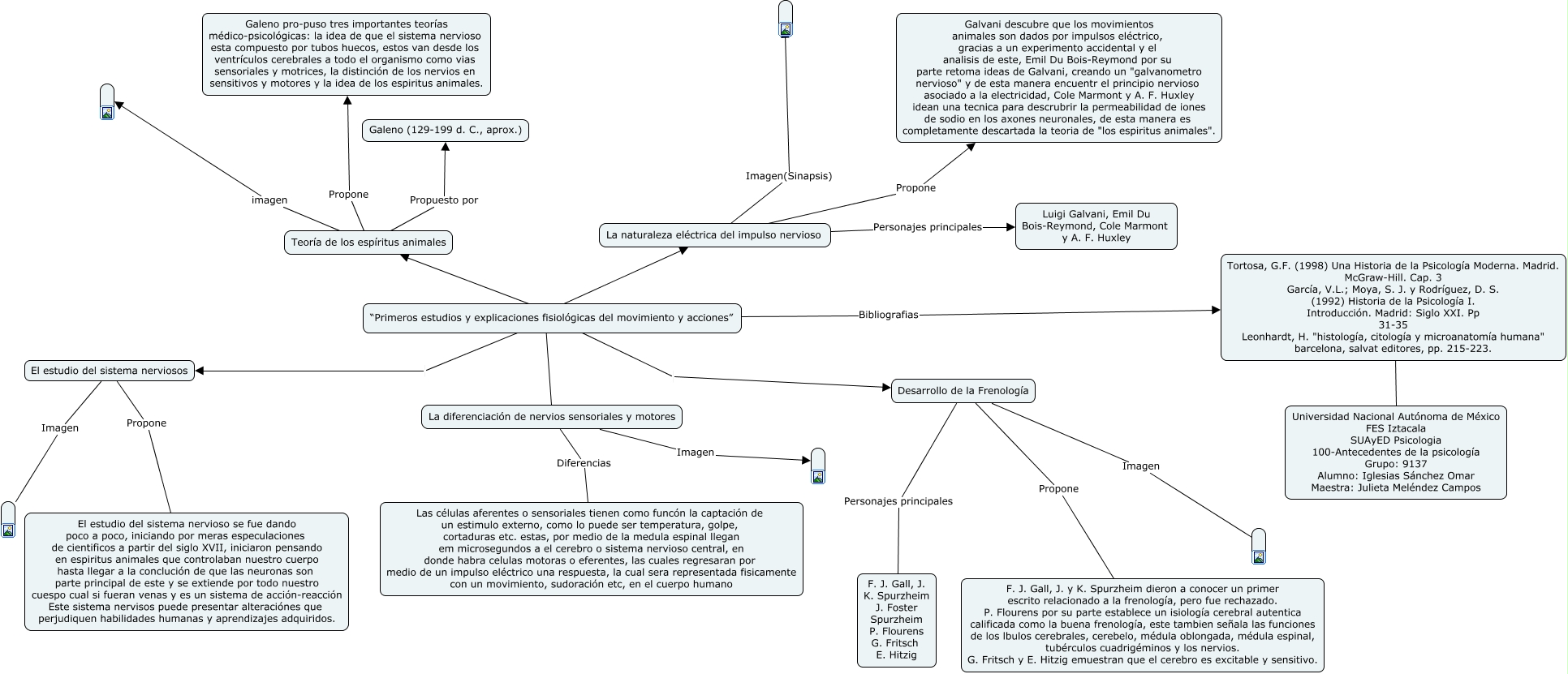 Este Cmap, tiene información relacionada con: Iglesias_actividad 4 Psi, Teoría de los espíritus animales Propone Galeno pro-puso tres importantes teorías médico-psicológicas: la idea de que el sistema nervioso esta compuesto por tubos huecos, estos van desde los ventrículos cerebrales a todo el organismo como vias sensoriales y motrices, la distinción de los nervios en sensitivos y motores y la idea de los espiritus animales., La diferenciación de nervios sensoriales y motores Imagen, “Primeros estudios y explicaciones fisiológicas del movimiento y acciones” Bibliografias Tortosa, G.F. (1998) Una Historia de la Psicología Moderna. Madrid. McGraw-Hill. Cap. 3 García, V.L.; Moya, S. J. y Rodríguez, D. S. (1992) Historia de la Psicología I. Introducción. Madrid: Siglo XXI. Pp 31-35 Leonhardt, H. "histología, citología y microanatomía humana" barcelona, salvat editores, pp. 215-223., La naturaleza eléctrica del impulso nervioso Personajes principales Luigi Galvani, Emil Du Bois-Reymond, Cole Marmont y A. F. Huxley, La naturaleza eléctrica del impulso nervioso Propone Galvani descubre que los movimientos animales son dados por impulsos eléctrico, gracias a un experimento accidental y el analisis de este, Emil Du Bois-Reymond por su parte retoma ideas de Galvani, creando un "galvanometro nervioso" y de esta manera encuentr el principio nervioso asociado a la electricidad, Cole Marmont y A. F. Huxley idean una tecnica para descrubrir la permeabilidad de iones de sodio en los axones neuronales, de esta manera es completamente descartada la teoria de "los espiritus animales"., Tortosa, G.F. (1998) Una Historia de la Psicología Moderna. Madrid. McGraw-Hill. Cap. 3 García, V.L.; Moya, S. J. y Rodríguez, D. S. (1992) Historia de la Psicología I. Introducción. Madrid: Siglo XXI. Pp 31-35 Leonhardt, H. "histología, citología y microanatomía humana" barcelona, salvat editores, pp. 215-223. ???? Universidad Nacional Autónoma de México FES Iztacala SUAyED Psicologia 100-Antecedentes de la psicología Grupo: 9137 Alumno: Iglesias Sánchez Omar Maestra: Julieta Meléndez Campos, La naturaleza eléctrica del impulso nervioso Imagen(Sinapsis), La diferenciación de nervios sensoriales y motores Diferencias Las células aferentes o sensoriales tienen como funcón la captación de un estimulo externo, como lo puede ser temperatura, golpe, cortaduras etc. estas, por medio de la medula espinal llegan em microsegundos a el cerebro o sistema nervioso central, en donde habra celulas motoras o eferentes, las cuales regresaran por medio de un impulso eléctrico una respuesta, la cual sera representada fisicamente con un movimiento, sudoración etc, en el cuerpo humano, “Primeros estudios y explicaciones fisiológicas del movimiento y acciones” Desarrollo de la Frenología, Desarrollo de la Frenología Propone F. J. Gall, J. y K. Spurzheim dieron a conocer un primer escrito relacionado a la frenología, pero fue rechazado. P. Flourens por su parte establece un isiología cerebral autentica calificada como la buena frenología, este tambien señala las funciones de los lbulos cerebrales, cerebelo, médula oblongada, médula espinal, tubérculos cuadrigéminos y los nervios. G. Fritsch y E. Hitzig emuestran que el cerebro es excitable y sensitivo., Teoría de los espíritus animales Propuesto por Galeno (129-199 d. C., aprox.), Desarrollo de la Frenología Imagen, Desarrollo de la Frenología Personajes principales F. J. Gall, J. K. Spurzheim J. Foster Spurzheim P. Flourens G. Fritsch E. Hitzig, El estudio del sistema nerviosos Propone El estudio del sistema nervioso se fue dando poco a poco, iniciando por meras especulaciones de cientificos a partir del siglo XVII, iniciaron pensando en espiritus animales que controlaban nuestro cuerpo hasta llegar a la conclución de que las neuronas son parte principal de este y se extiende por todo nuestro cuespo cual si fueran venas y es un sistema de acción-reacción Este sistema nervisos puede presentar alteraciónes que perjudiquen habilidades humanas y aprendizajes adquiridos., “Primeros estudios y explicaciones fisiológicas del movimiento y acciones” El estudio del sistema nerviosos, La diferenciación de nervios sensoriales y motores ???? “Primeros estudios y explicaciones fisiológicas del movimiento y acciones”, “Primeros estudios y explicaciones fisiológicas del movimiento y acciones” ???? Teoría de los espíritus animales, “Primeros estudios y explicaciones fisiológicas del movimiento y acciones” ???? La naturaleza eléctrica del impulso nervioso, El estudio del sistema nerviosos Imagen, Teoría de los espíritus animales imagen