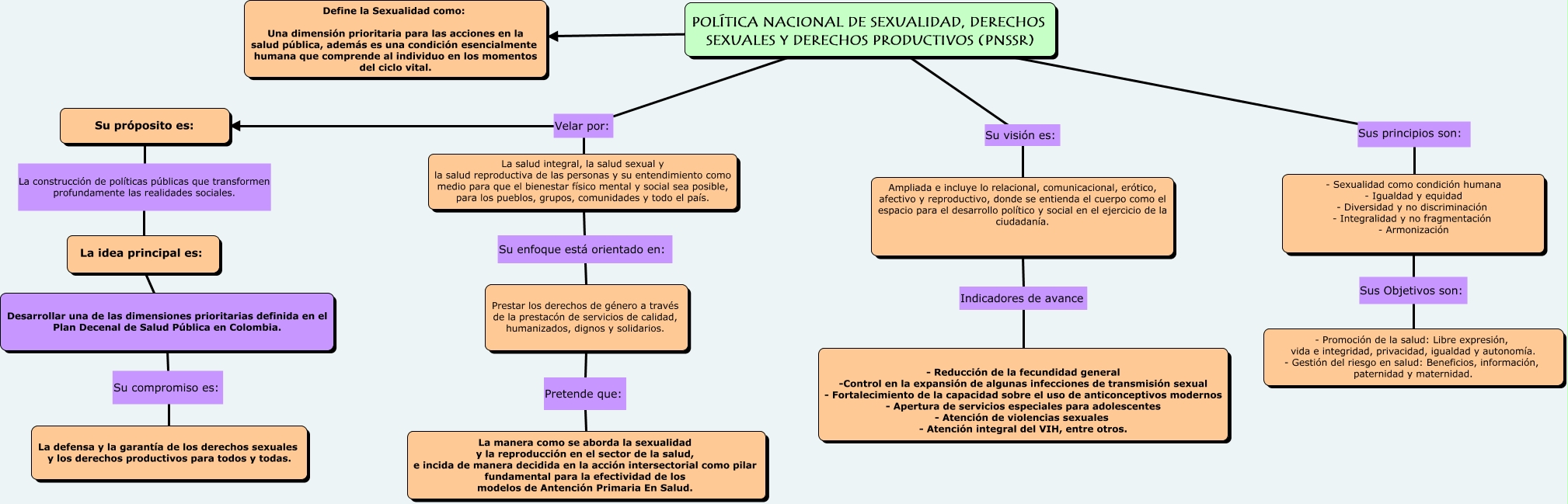 Este Cmap, tiene información relacionada con: Política Nacional de Sexualidad, La salud integral, la salud sexual y la salud reproductiva de las personas y su entendimiento como medio para que el bienestar físico mental y social sea posible, para los pueblos, grupos, comunidades y todo el país. Su enfoque está orientado en: Prestar los derechos de género a través de la prestacón de servicios de calidad, humanizados, dignos y solidarios., POLÍTICA NACIONAL DE SEXUALIDAD, DERECHOS SEXUALES Y DERECHOS PRODUCTIVOS (PNSSR) Sus principios son: - Sexualidad como condición humana - Igualdad y equidad - Diversidad y no discriminación - Integralidad y no fragmentación - Armonización, Ampliada e incluye lo relacional, comunicacional, erótico, afectivo y reproductivo, donde se entienda el cuerpo como el espacio para el desarrollo político y social en el ejercicio de la ciudadanía. Indicadores de avance - Reducción de la fecundidad general -Control en la expansión de algunas infecciones de transmisión sexual - Fortalecimiento de la capacidad sobre el uso de anticonceptivos modernos - Apertura de servicios especiales para adolescentes - Atención de violencias sexuales - Atención integral del VIH, entre otros., POLÍTICA NACIONAL DE SEXUALIDAD, DERECHOS SEXUALES Y DERECHOS PRODUCTIVOS (PNSSR) Velar por: La salud integral, la salud sexual y la salud reproductiva de las personas y su entendimiento como medio para que el bienestar físico mental y social sea posible, para los pueblos, grupos, comunidades y todo el país., POLÍTICA NACIONAL DE SEXUALIDAD, DERECHOS SEXUALES Y DERECHOS PRODUCTIVOS (PNSSR) Velar por: Su próposito es:, La idea principal es: ???? Desarrollar una de las dimensiones prioritarias definida en el Plan Decenal de Salud Pública en Colombia., Prestar los derechos de género a través de la prestacón de servicios de calidad, humanizados, dignos y solidarios. Pretende que: La manera como se aborda la sexualidad y la reproducción en el sector de la salud, e incida de manera decidida en la acción intersectorial como pilar fundamental para la efectividad de los modelos de Antención Primaria En Salud., Desarrollar una de las dimensiones prioritarias definida en el Plan Decenal de Salud Pública en Colombia. Su compromiso es: La defensa y la garantía de los derechos sexuales y los derechos productivos para todos y todas., POLÍTICA NACIONAL DE SEXUALIDAD, DERECHOS SEXUALES Y DERECHOS PRODUCTIVOS (PNSSR) Su visión es: Ampliada e incluye lo relacional, comunicacional, erótico, afectivo y reproductivo, donde se entienda el cuerpo como el espacio para el desarrollo político y social en el ejercicio de la ciudadanía., - Sexualidad como condición humana - Igualdad y equidad - Diversidad y no discriminación - Integralidad y no fragmentación - Armonización Sus Objetivos son: - Promoción de la salud: Libre expresión, vida e integridad, privacidad, igualdad y autonomía. - Gestión del riesgo en salud: Beneficios, información, paternidad y maternidad., POLÍTICA NACIONAL DE SEXUALIDAD, DERECHOS SEXUALES Y DERECHOS PRODUCTIVOS (PNSSR) ???? Define la Sexualidad como: Una dimensión prioritaria para las acciones en la salud pública, además es una condición esencialmente humana que comprende al individuo en los momentos del ciclo vital., Su próposito es: La construcción de políticas públicas que transformen profundamente las realidades sociales. La idea principal es: