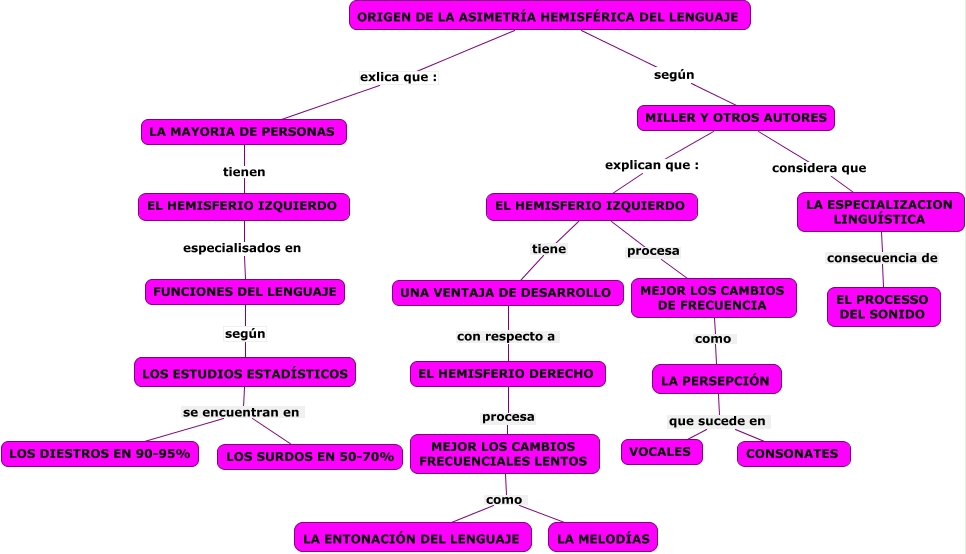 Este Cmap, tiene información relacionada con: TEXTO1, LA MAYORIA DE PERSONAS tienen EL HEMISFERIO IZQUIERDO, LA PERSEPCIÓN que sucede en CONSONATES, LOS ESTUDIOS ESTADÍSTICOS se encuentran en LOS DIESTROS EN 90-95%, MEJOR LOS CAMBIOS FRECUENCIALES LENTOS como LA ENTONACIÓN DEL LENGUAJE, MEJOR LOS CAMBIOS DE FRECUENCIA como LA PERSEPCIÓN, FUNCIONES DEL LENGUAJE según LOS ESTUDIOS ESTADÍSTICOS, LA PERSEPCIÓN que sucede en VOCALES, LA ESPECIALIZACION LINGUÍSTICA consecuencia de EL PROCESSO DEL SONIDO, MILLER Y OTROS AUTORES considera que LA ESPECIALIZACION LINGUÍSTICA, LOS ESTUDIOS ESTADÍSTICOS se encuentran en LOS SURDOS EN 50-70%, EL HEMISFERIO IZQUIERDO tiene UNA VENTAJA DE DESARROLLO, EL HEMISFERIO IZQUIERDO procesa MEJOR LOS CAMBIOS DE FRECUENCIA, EL HEMISFERIO DERECHO procesa MEJOR LOS CAMBIOS FRECUENCIALES LENTOS, ORIGEN DE LA ASIMETRÍA HEMISFÉRICA DEL LENGUAJE exlica que : LA MAYORIA DE PERSONAS, ORIGEN DE LA ASIMETRÍA HEMISFÉRICA DEL LENGUAJE según MILLER Y OTROS AUTORES, EL HEMISFERIO IZQUIERDO especialisados en FUNCIONES DEL LENGUAJE, MEJOR LOS CAMBIOS FRECUENCIALES LENTOS como LA MELODÍAS, UNA VENTAJA DE DESARROLLO con respecto a EL HEMISFERIO DERECHO, MILLER Y OTROS AUTORES explican que : EL HEMISFERIO IZQUIERDO