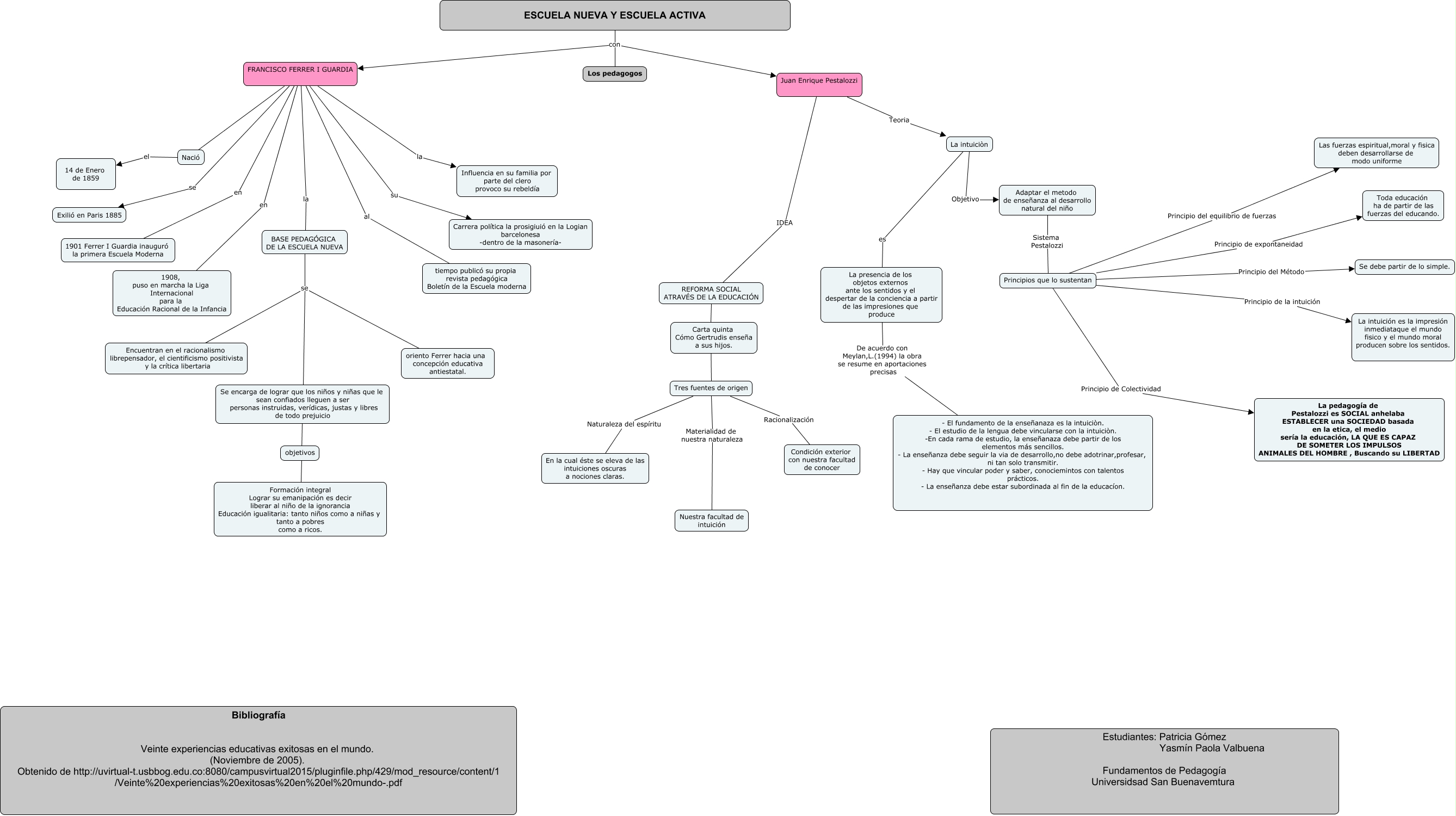 Este Cmap, tiene información relacionada con: MAPA CONCEPTUAL PEDAGOGOS, BASE PEDAGÓGICA DE LA ESCUELA NUEVA se Encuentran en el racionalismo librepensador, el cientificismo positivista y la crítica libertaria, ESCUELA NUEVA Y ESCUELA ACTIVA con Los pedagogos, Juan Enrique Pestalozzi IDEA REFORMA SOCIAL ATRAVÉS DE LA EDUCACIÓN, Nació el 14 de Enero de 1859, Tres fuentes de origen Racionalización Condición exterior con nuestra facultad de conocer, FRANCISCO FERRER I GUARDIA en 1901 Ferrer I Guardia inauguró la primera Escuela Moderna, Juan Enrique Pestalozzi Teoria La intuiciòn, FRANCISCO FERRER I GUARDIA se Exilió en Paris 1885, La presencia de los objetos externos ante los sentidos y el despertar de la conciencia a partir de las impresiones que produce De acuerdo con Meylan,L.(1994) la obra se resume en aportaciones precisas - El fundamento de la enseñanaza es la intuiciòn. - El estudio de la lengua debe vincularse con la intuiciòn. -En cada rama de estudio, la enseñanaza debe partir de los elementos más sencillos. - La enseñanza debe seguir la via de desarrollo,no debe adotrinar,profesar, ni tan solo transmitir. - Hay que vincular poder y saber, conociemintos con talentos prácticos. - La enseñanza debe estar subordinada al fin de la educacíon., REFORMA SOCIAL ATRAVÉS DE LA EDUCACIÓN ???? Tres fuentes de origen, Tres fuentes de origen Naturaleza del espíritu En la cual éste se eleva de las intuiciones oscuras a nociones claras., FRANCISCO FERRER I GUARDIA la Influencia en su familia por parte del clero provoco su rebeldía, La intuiciòn es La presencia de los objetos externos ante los sentidos y el despertar de la conciencia a partir de las impresiones que produce, FRANCISCO FERRER I GUARDIA su Carrera política la prosigiuió en la Logian barcelonesa -dentro de la masonería-, BASE PEDAGÓGICA DE LA ESCUELA NUEVA se Se encarga de lograr que los niños y niñas que le sean confiados lleguen a ser personas instruidas, verídicas, justas y libres de todo prejuicio, FRANCISCO FERRER I GUARDIA al tiempo publicó su propia revista pedagógica Boletín de la Escuela moderna, Adaptar el metodo de enseñanza al desarrollo natural del niño Sistema Pestalozzi Principios que lo sustentan, Principios que lo sustentan Principio de Colectividad La pedagogía de Pestalozzi es SOCIAL anhelaba ESTABLECER una SOCIEDAD basada en la etica, el medio sería la educación, LA QUE ES CAPAZ DE SOMETER LOS IMPULSOS ANIMALES DEL HOMBRE , Buscando su LIBERTAD, FRANCISCO FERRER I GUARDIA la BASE PEDAGÓGICA DE LA ESCUELA NUEVA, BASE PEDAGÓGICA DE LA ESCUELA NUEVA se oriento Ferrer hacia una concepción educativa antiestatal.