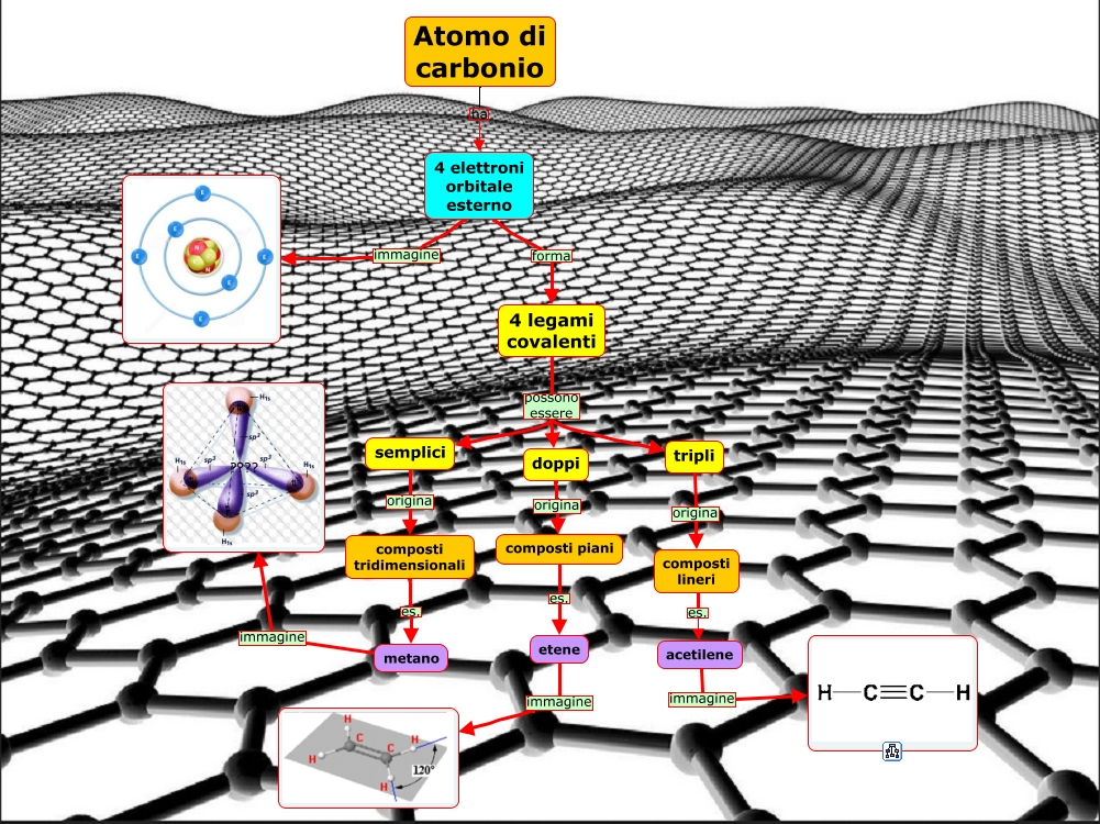 Questa Cmap, creata con IHMC CmapTools, contiene informazioni relative a: 9.1 a atomo di carbonio, acetilene immagine, 4 legami covalenti possono essere semplici, composti lineri es. acetilene, metano immagine ????, doppi origina composti piani, semplici origina composti tridimensionali, Atomo di carbonio ha 4 elettroni orbitale esterno, composti tridimensionali es. metano, 4 legami covalenti possono essere doppi, 4 legami covalenti possono essere tripli, 4 elettroni orbitale esterno forma 4 legami covalenti, 4 elettroni orbitale esterno immagine, tripli origina composti lineri, composti piani es. etene, etene immagine