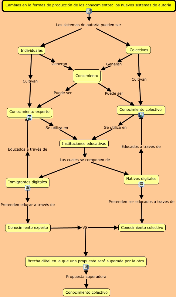 Este Cmap, tiene información relacionada con: cambios en las formas de producción de los conocimientos los nuevos sistemas de autoría, Brecha diital en la que una propuesta será superada por la otra Propuesta superadora Conocimiento colectivo, Conocimiento colectivo Se utiliza en Instituciones educativas, Individuales Cultivan Conocimiento experto, Nativos digitales Pretenden ser educados a través de Conocimiento colectivo, Cambios en la formas de producción de los conocimientos: los nuevos sistemas de autoría Los sistemas de autoría pueden ser Individuales, Colectivos Cultivan Conocimiento colectivo, Inmigrantes digitales Educados a través de ????, Conocimiento experto VS Brecha diital en la que una propuesta será superada por la otra, Nativos digitales Educados a través de Conocimiento colectivo, Inmigrantes digitales Pretenden educar a través de Conocimiento experto, Concimiento Puede ser Conocimiento colectivo, Colectivos Generan Concimiento, Instituciones educativas Las cuales se componen de Inmigrantes digitales, Individuales Generan Concimiento, Cambios en la formas de producción de los conocimientos: los nuevos sistemas de autoría Los sistemas de autoría pueden ser Colectivos, Conocimiento experto VS Conocimiento colectivo, Concimiento Puede ser Conocimiento experto, Instituciones educativas Las cuales se componen de Nativos digitales, Conocimiento experto Se utiliza en Instituciones educativas