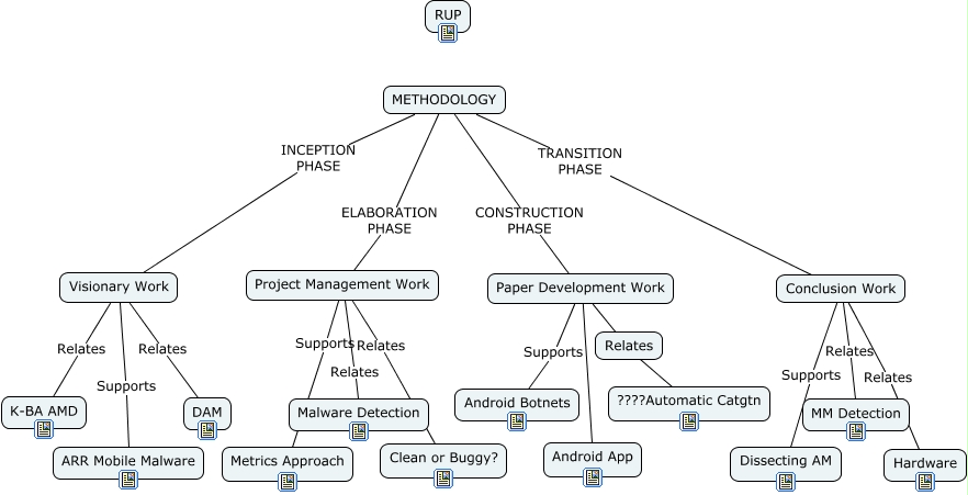 This Concept Map, created with IHMC CmapTools, has information related to: Final Project, METHODOLOGY TRANSITION PHASE Conclusion Work, Project Management Work Supports Metrics Approach, Conclusion Work Relates MM Detection, Visionary Work Relates K-BA AMD, METHODOLOGY ELABORATION PHASE Project Management Work, Paper Development Work ???? Android App, Visionary Work Supports ARR Mobile Malware, Paper Development Work Supports Android Botnets, Visionary Work Relates DAM, Conclusion Work Relates Hardware, Paper Development Work ???? ????Automatic Catgtn, Project Management Work Relates Clean or Buggy?, METHODOLOGY INCEPTION PHASE Visionary Work, Conclusion Work Supports Dissecting AM, METHODOLOGY CONSTRUCTION PHASE Paper Development Work, Project Management Work Relates Malware Detection