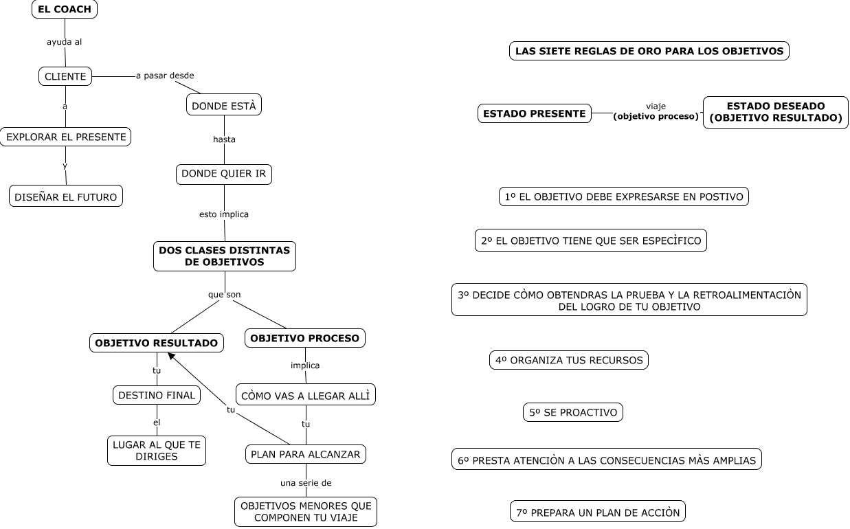 Este Cmap, tiene información relacionada con: Las siete reglas de oro de los objetivos O'CONNOR, CLIENTE a EXPLORAR EL PRESENTE, CLIENTE a pasar desde DONDE ESTÀ, PLAN PARA ALCANZAR tu OBJETIVO RESULTADO, PLAN PARA ALCANZAR una serie de OBJETIVOS MENORES QUE COMPONEN TU VIAJE, OBJETIVO PROCESO implica CÒMO VAS A LLEGAR ALLÌ, DONDE ESTÀ hasta DONDE QUIER IR, DESTINO FINAL el LUGAR AL QUE TE DIRIGES, DOS CLASES DISTINTAS DE OBJETIVOS que son OBJETIVO PROCESO, CÒMO VAS A LLEGAR ALLÌ tu PLAN PARA ALCANZAR, DOS CLASES DISTINTAS DE OBJETIVOS que son OBJETIVO RESULTADO, ESTADO PRESENTE viaje (objetivo proceso) ESTADO DESEADO (OBJETIVO RESULTADO), EL COACH ayuda al CLIENTE, EXPLORAR EL PRESENTE y DISEÑAR EL FUTURO, DONDE QUIER IR esto implica DOS CLASES DISTINTAS DE OBJETIVOS, OBJETIVO RESULTADO tu DESTINO FINAL