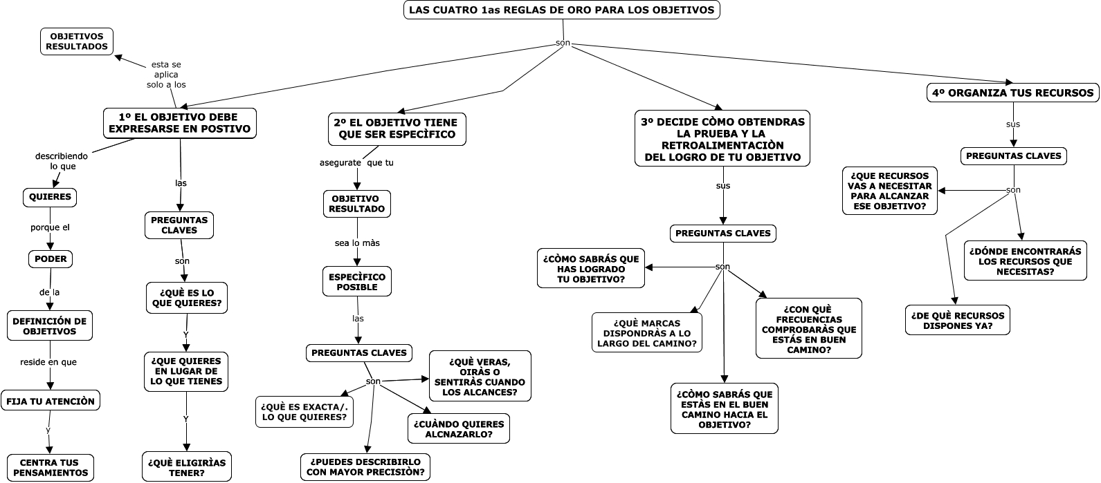 Este Cmap, tiene información relacionada con: Las cuatro 1as reglas de oro de los objetivos DESARROLLADAS O'CONNOR, DEFINICIÓN DE OBJETIVOS reside en que FIJA TU ATENCIÒN, 2º EL OBJETIVO TIENE QUE SER ESPECÌFICO asegurate que tu OBJETIVO RESULTADO, PREGUNTAS CLAVES son ¿CUÀNDO QUIERES ALCNAZARLO?, 3º DECIDE CÒMO OBTENDRAS LA PRUEBA Y LA RETROALIMENTACIÒN DEL LOGRO DE TU OBJETIVO sus PREGUNTAS CLAVES, OBJETIVO RESULTADO sea lo màs ESPECÌFICO POSIBLE, 1º EL OBJETIVO DEBE EXPRESARSE EN POSTIVO las PREGUNTAS CLAVES, QUIERES porque el PODER, 2º EL OBJETIVO TIENE QUE SER ESPECÌFICO asegurate que tu OBJETIVO RESULTADO, PREGUNTAS CLAVES son ¿CON QUÈ FRECUENCIAS COMPROBARÀS QUE ESTÁS EN BUEN CAMINO?, 1º EL OBJETIVO DEBE EXPRESARSE EN POSTIVO las PREGUNTAS CLAVES, LAS CUATRO 1as REGLAS DE ORO PARA LOS OBJETIVOS son 3º DECIDE CÒMO OBTENDRAS LA PRUEBA Y LA RETROALIMENTACIÒN DEL LOGRO DE TU OBJETIVO, QUIERES porque el PODER, ¿QUÈ ES LO QUE QUIERES? Y ¿QUE QUIERES EN LUGAR DE LO QUE TIENES, PREGUNTAS CLAVES son ¿CON QUÈ FRECUENCIAS COMPROBARÀS QUE ESTÁS EN BUEN CAMINO?, PREGUNTAS CLAVES son ¿DE QUÈ RECURSOS DISPONES YA?, PREGUNTAS CLAVES son ¿QUÈ ES EXACTA/. LO QUE QUIERES?, PREGUNTAS CLAVES son ¿CÒMO SABRÁS QUE HAS LOGRADO TU OBJETIVO?, PREGUNTAS CLAVES son ¿QUÈ ES LO QUE QUIERES?, PREGUNTAS CLAVES son ¿CUÀNDO QUIERES ALCNAZARLO?, PREGUNTAS CLAVES son ¿QUE RECURSOS VAS A NECESITAR PARA ALCANZAR ESE OBJETIVO?