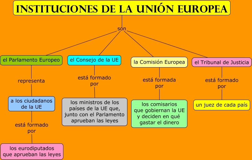 Este Cmap, tiene información relacionada con: Instituciones de la Unión Europea, INSTITUCIONES DE LA UNIÓN EUROPEA son el Parlamento Europeo, el Tribunal de Justicia está formado por un juez de cada país, a los ciudadanos de la UE está formado por los eurodiputados que aprueban las leyes, la Comisión Europea está formada por los comisarios que gobiernan la UE y deciden en qué gastar el dinero, el Consejo de la UE está formado por los ministros de los países de la UE que, junto con el Parlamento aprueban las leyes, INSTITUCIONES DE LA UNIÓN EUROPEA son la Comisión Europea, INSTITUCIONES DE LA UNIÓN EUROPEA son el Tribunal de Justicia, el Parlamento Europeo representa a los ciudadanos de la UE, INSTITUCIONES DE LA UNIÓN EUROPEA son el Consejo de la UE