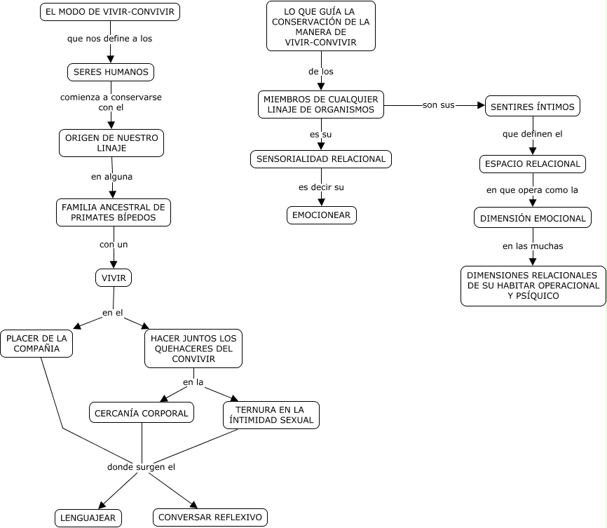 Este Cmap, tiene información relacionada con: Lo que guía la conservación de la manera de vivir-convivir, ESPACIO RELACIONAL en que opera como la DIMENSIÓN EMOCIONAL, TERNURA EN LA ÍNTIMIDAD SEXUAL donde surgen el CONVERSAR REFLEXIVO, SENSORIALIDAD RELACIONAL es decir su EMOCIONEAR, HACER JUNTOS LOS QUEHACERES DEL CONVIVIR en la CERCANÍA CORPORAL, VIVIR en el HACER JUNTOS LOS QUEHACERES DEL CONVIVIR, CERCANÍA CORPORAL donde surgen el LENGUAJEAR, VIVIR en el PLACER DE LA COMPAÑIA, PLACER DE LA COMPAÑIA donde surgen el CONVERSAR REFLEXIVO, PLACER DE LA COMPAÑIA donde surgen el LENGUAJEAR, FAMILIA ANCESTRAL DE PRIMATES BÍPEDOS con un VIVIR, TERNURA EN LA ÍNTIMIDAD SEXUAL donde surgen el LENGUAJEAR, ORIGEN DE NUESTRO LINAJE en alguna FAMILIA ANCESTRAL DE PRIMATES BÍPEDOS, MIEMBROS DE CUALQUIER LINAJE DE ORGANISMOS son sus SENTIRES ÍNTIMOS, CERCANÍA CORPORAL donde surgen el CONVERSAR REFLEXIVO, DIMENSIÓN EMOCIONAL en las muchas DIMENSIONES RELACIONALES DE SU HABITAR OPERACIONAL Y PSÍQUICO, LO QUE GUÍA LA CONSERVACIÓN DE LA MANERA DE VIVIR-CONVIVIR de los MIEMBROS DE CUALQUIER LINAJE DE ORGANISMOS, SERES HUMANOS comienza a conservarse con el ORIGEN DE NUESTRO LINAJE, SENTIRES ÍNTIMOS que definen el ESPACIO RELACIONAL, EL MODO DE VIVIR-CONVIVIR que nos define a los SERES HUMANOS, MIEMBROS DE CUALQUIER LINAJE DE ORGANISMOS es su SENSORIALIDAD RELACIONAL