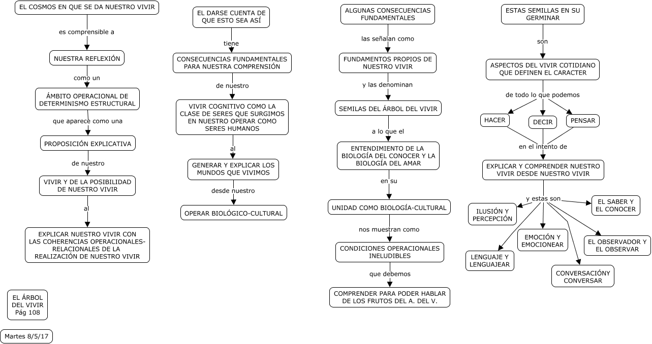 Este Cmap, tiene información relacionada con: LO POSIBLE Y LO IMPOSIBLE, PROPOSICIÓN EXPLICATIVA de nuestro VIVIR Y DE LA POSIBILIDAD DE NUESTRO VIVIR, UNIDAD COMO BIOLOGÍA-CULTURAL nos muestran como CONDICIONES OPERACIONALES INELUDIBLES, EXPLICAR Y COMPRENDER NUESTRO VIVIR DESDE NUESTRO VIVIR y estas son EL SABER Y EL CONOCER, ALGUNAS CONSECUENCIAS FUNDAMENTALES las señalan como FUNDAMENTOS PROPIOS DE NUESTRO VIVIR, VIVIR Y DE LA POSIBILIDAD DE NUESTRO VIVIR al EXPLICAR NUESTRO VIVIR CON LAS COHERENCIAS OPERACIONALES- RELACIONALES DE LA REALIZACIÓN DE NUESTRO VIVIR, CONDICIONES OPERACIONALES INELUDIBLES que debemos COMPRENDER PARA PODER HABLAR DE LOS FRUTOS DEL A. DEL V., CONSECUENCIAS FUNDAMENTALES PARA NUESTRA COMPRENSIÓN de nuestro VIVIR COGNITIVO COMO LA CLASE DE SERES QUE SURGIMOS EN NUESTRO OPERAR COMO SERES HUMANOS, EL COSMOS EN QUE SE DA NUESTRO VIVIR es comprensible a NUESTRA REFLEXIÓN, FUNDAMENTOS PROPIOS DE NUESTRO VIVIR y las denominan SEMILAS DEL ÁRBOL DEL VIVIR, DECIR en el intento de EXPLICAR Y COMPRENDER NUESTRO VIVIR DESDE NUESTRO VIVIR, PENSAR en el intento de EXPLICAR Y COMPRENDER NUESTRO VIVIR DESDE NUESTRO VIVIR, ÁMBITO OPERACIONAL DE DETERMINISMO ESTRUCTURAL que aparece como una PROPOSICIÓN EXPLICATIVA, EXPLICAR Y COMPRENDER NUESTRO VIVIR DESDE NUESTRO VIVIR y estas son LENGUAJE Y LENGUAJEAR, ESTAS SEMILLAS EN SU GERMINAR son ASPECTOS DEL VIVIR COTIDIANO QUE DEFINEN EL CARACTER, ASPECTOS DEL VIVIR COTIDIANO QUE DEFINEN EL CARACTER de todo lo que podemos DECIR, HACER en el intento de EXPLICAR Y COMPRENDER NUESTRO VIVIR DESDE NUESTRO VIVIR, EL DARSE CUENTA DE QUE ESTO SEA ASÍ tiene CONSECUENCIAS FUNDAMENTALES PARA NUESTRA COMPRENSIÓN, ASPECTOS DEL VIVIR COTIDIANO QUE DEFINEN EL CARACTER de todo lo que podemos HACER, EXPLICAR Y COMPRENDER NUESTRO VIVIR DESDE NUESTRO VIVIR y estas son EL OBSERVADOR Y EL OBSERVAR, SEMILAS DEL ÁRBOL DEL VIVIR a lo que el ENTENDIMIENTO DE LA BIOLOGÍA DEL CONOCER Y LA BIOLOGÍA DEL AMAR
