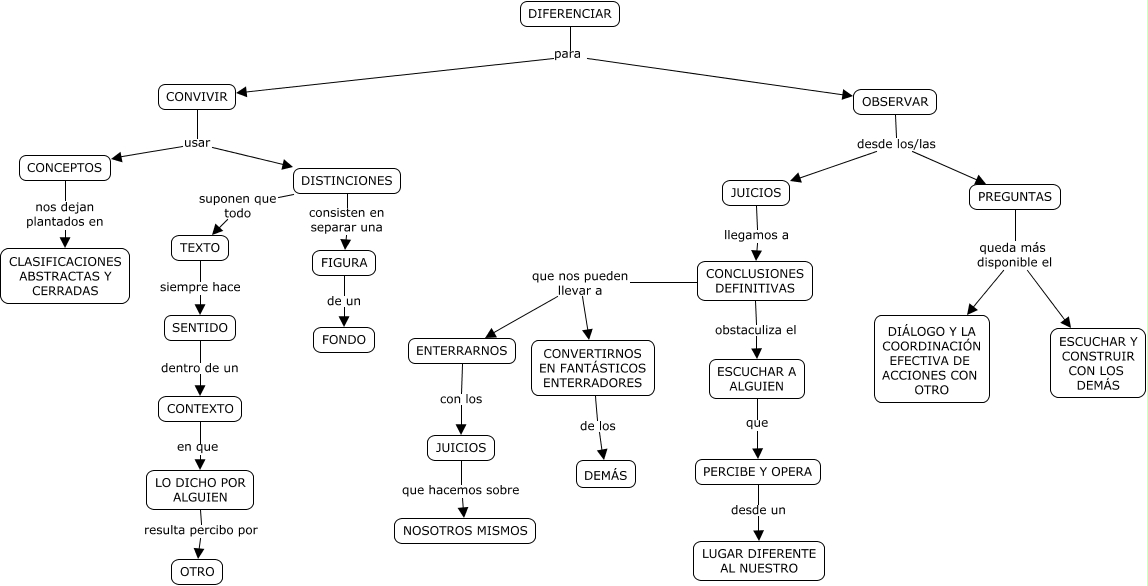Este Cmap, tiene información relacionada con: DIFERENCIAR al coachear - CONCEPTOS DE DISTINCIONES; PREGUNTAS desde los JUICIOS o desde PREGUNTAS, CONCLUSIONES DEFINITIVAS que nos pueden llevar a CONVERTIRNOS EN FANTÁSTICOS ENTERRADORES, JUICIOS que hacemos sobre NOSOTROS MISMOS, DIFERENCIAR para OBSERVAR, DIFERENCIAR para CONVIVIR, ENTERRARNOS con los JUICIOS, SENTIDO dentro de un CONTEXTO, CONCLUSIONES DEFINITIVAS obstaculiza el ESCUCHAR A ALGUIEN, PREGUNTAS queda más disponible el ESCUCHAR Y CONSTRUIR CON LOS DEMÁS, TEXTO siempre hace SENTIDO, CONVERTIRNOS EN FANTÁSTICOS ENTERRADORES de los DEMÁS, DISTINCIONES suponen que todo TEXTO, CONCLUSIONES DEFINITIVAS que nos pueden llevar a ENTERRARNOS, ESCUCHAR A ALGUIEN que PERCIBE Y OPERA, OBSERVAR desde los/las PREGUNTAS, OBSERVAR desde los/las JUICIOS, CONTEXTO en que LO DICHO POR ALGUIEN, PREGUNTAS queda más disponible el DIÁLOGO Y LA COORDINACIÓN EFECTIVA DE ACCIONES CON OTRO, FIGURA de un FONDO, DISTINCIONES consisten en separar una FIGURA, CONCEPTOS nos dejan plantados en CLASIFICACIONES ABSTRACTAS Y CERRADAS
