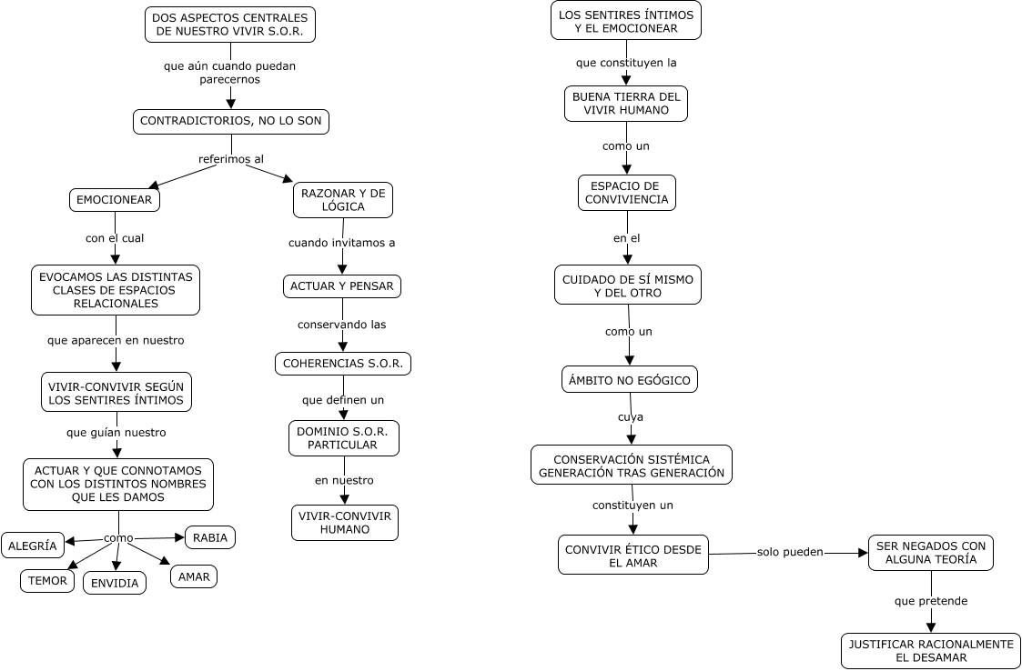 Este Cmap, tiene información relacionada con: Los sentires íntimos y el emocionear - razonar, ACTUAR Y PENSAR conservando las COHERENCIAS S.O.R., LOS SENTIRES ÍNTIMOS Y EL EMOCIONEAR que constituyen la BUENA TIERRA DEL VIVIR HUMANO, ACTUAR Y QUE CONNOTAMOS CON LOS DISTINTOS NOMBRES QUE LES DAMOS como ALEGRÍA, ÁMBITO NO EGÓGICO cuya CONSERVACIÓN SISTÉMICA GENERACIÓN TRAS GENERACIÓN, CONTRADICTORIOS, NO LO SON referimos al EMOCIONEAR, VIVIR-CONVIVIR SEGÚN LOS SENTIRES ÍNTIMOS que guían nuestro ACTUAR Y QUE CONNOTAMOS CON LOS DISTINTOS NOMBRES QUE LES DAMOS, CONSERVACIÓN SISTÉMICA GENERACIÓN TRAS GENERACIÓN constituyen un CONVIVIR ÉTICO DESDE EL AMAR, COHERENCIAS S.O.R. que definen un DOMINIO S.O.R. PARTICULAR, DOS ASPECTOS CENTRALES DE NUESTRO VIVIR S.O.R. que aún cuando puedan parecernos CONTRADICTORIOS, NO LO SON, DOMINIO S.O.R. PARTICULAR en nuestro VIVIR-CONVIVIR HUMANO, ACTUAR Y QUE CONNOTAMOS CON LOS DISTINTOS NOMBRES QUE LES DAMOS como RABIA, RAZONAR Y DE LÓGICA cuando invitamos a ACTUAR Y PENSAR, CUIDADO DE SÍ MISMO Y DEL OTRO como un ÁMBITO NO EGÓGICO, BUENA TIERRA DEL VIVIR HUMANO como un ESPACIO DE CONVIVIENCIA, ACTUAR Y QUE CONNOTAMOS CON LOS DISTINTOS NOMBRES QUE LES DAMOS como AMAR, ESPACIO DE CONVIVIENCIA en el CUIDADO DE SÍ MISMO Y DEL OTRO, CONTRADICTORIOS, NO LO SON referimos al RAZONAR Y DE LÓGICA, ACTUAR Y QUE CONNOTAMOS CON LOS DISTINTOS NOMBRES QUE LES DAMOS como TEMOR, SER NEGADOS CON ALGUNA TEORÍA que pretende JUSTIFICAR RACIONALMENTE EL DESAMAR, EVOCAMOS LAS DISTINTAS CLASES DE ESPACIOS RELACIONALES que aparecen en nuestro VIVIR-CONVIVIR SEGÚN LOS SENTIRES ÍNTIMOS