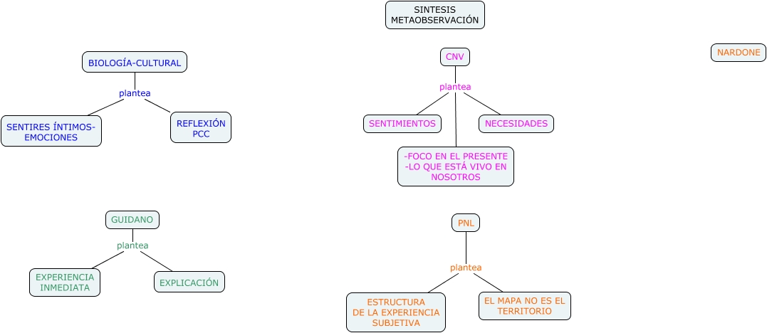 Este Cmap, tiene información relacionada con: SINTESIS - METAOBSERVACIÓN, GUIDANO plantea EXPERIENCIA INMEDIATA, CNV plantea -FOCO EN EL PRESENTE -LO QUE ESTÁ VIVO EN NOSOTROS, BIOLOGÍA-CULTURAL plantea REFLEXIÓN PCC, PNL plantea ESTRUCTURA DE LA EXPERIENCIA SUBJETIVA, BIOLOGÍA-CULTURAL plantea SENTIRES ÍNTIMOS- EMOCIONES, GUIDANO plantea EXPLICACIÓN, PNL plantea EL MAPA NO ES EL TERRITORIO, CNV plantea NECESIDADES, CNV plantea SENTIMIENTOS