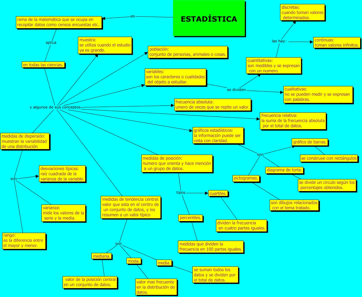 Este Cmap, tiene información relacionada con: estadistica, diagrama de torta. ???? se divide un circulo según los porcentajes obtenidos., medidas de tendencia central: valor que esta en el centro de un conjunto de datos, y los resumen a un valor típico son media., en todas las ciencias. y algunos de sus conceptos frecuencia relativa: la suma de la frecuencia absoluta por el total de datos., variables: son los caracteres o cualidades del objeto a estudiar. se dividen cualitativas: no se pueden medir y se expresan con palabras., se construye con rectángulos ???? gráfico de barras., medidas de posición: numero que orienta y hace mención a un grupo de datos. tipos cuartiles., medidas de posición: numero que orienta y hace mención a un grupo de datos. tipos percentiles., media. ???? se suman todos los datos y se dividen por el total de datos., en todas las ciencias. y algunos de sus conceptos frecuencia absoluta: umero de veces que se repite un valor., cuantitativas: son medibles y se expresan con un numero las hay: discretas: cuando toman valores determinados., cuantitativas: son medibles y se expresan con un numero las hay: continuas: toman valores infinitos., pictogramas. ???? son dibujos relacionados con el tema tratado., medidas de dispersión: muestran la variabilidad de una distribución son desviaciones típicas: raíz cuadrada de la varianza de la variable., medidas de dispersión: muestran la variabilidad de una distribución son varianza: mide los valores de la serie y la media., mediana. ???? valor de la posición central en un conjunto de datos., en todas las ciencias. y algunos de sus conceptos medidas de tendencia central: valor que esta en el centro de un conjunto de datos, y los resumen a un valor típico, rama de la matemática que se ocupa en recopilar datos como censos encuestas etc.. aplica en todas las ciencias., moda. ???? valor mas frecuente en la distribución de datos., medidas de dispersión: muestran la variabilidad de una distribución son rango: es la diferencia entre el mayor y menor., cuartiles. ???? dividen la frecuencia en cuatro partes iguales.