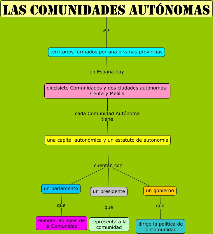 Este Cmap, tiene información relacionada con: Las Comunidades Autónomas, LAS COMUNIDADES AUTÓNOMAS son territorios formados por una o varias provincias, un gobierno que dirige la política de la Comunidad, un parlamento que elabora las leyes de la Comunidad, una capital autonómica y un estatuto de autonomía cuentan con un gobierno, una capital autonómica y un estatuto de autonomía cuentan con un presidente, un presidente que representa a la comunidad, diecisiete Comunidades y dos ciudades autónomas: Ceuta y Melilla cada Comunidad Autónoma tiene una capital autonómica y un estatuto de autonomía, una capital autonómica y un estatuto de autonomía cuentan con un parlamento, territorios formados por una o varias provincias en España hay diecisiete Comunidades y dos ciudades autónomas: Ceuta y Melilla