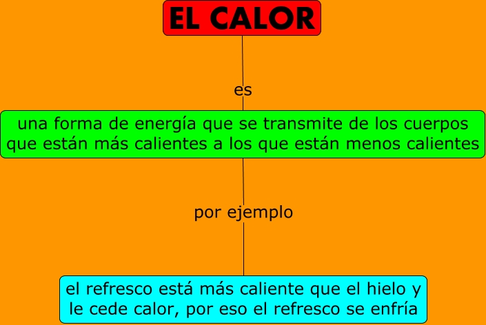 Este Cmap, tiene información relacionada con: El calor, una forma de energía que se transmite de los cuerpos que están más calientes a los que están menos calientes por ejemplo el refresco está más caliente que el hielo y le cede calor, por eso el refresco se enfría, EL CALOR es una forma de energía que se transmite de los cuerpos que están más calientes a los que están menos calientes