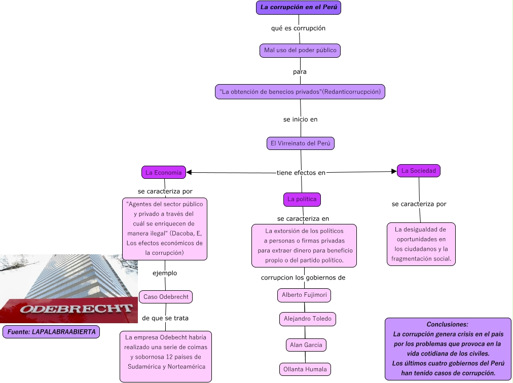 Este Cmap, tiene información relacionada con: La corrupción en el Perú, La Economía se caracteriza por "Agentes del sector público y privado a través del cuál se enriquecen de manera ilegal" (Dacoba, E, Los efectos económicos de la corrupción), El Virreinato del Perú tiene efectos en La Economía, Alberto Fujimori Ollanta Humala, El Virreinato del Perú tiene efectos en La política, La política se caracteriza en La extorsión de los políticos a personas o firmas privadas para extraer dinero para beneficio propio o del partido político., Alberto Fujimori ???? Ollanta Humala, "La obtención de benecios privados"(Redanticorrucpción) se inicio en El Virreinato del Perú, Caso Odebrecht de que se trata La empresa Odebecht habría realizado una serie de coimas y sobornosa 12 países de Sudamérica y Norteamérica, Mal uso del poder público para "La obtención de benecios privados"(Redanticorrucpción), "Agentes del sector público y privado a través del cuál se enriquecen de manera ilegal" (Dacoba, E, Los efectos económicos de la corrupción) ejemplo Caso Odebrecht, La extorsión de los políticos a personas o firmas privadas para extraer dinero para beneficio propio o del partido político. corrupcion los gobiernos de Alberto Fujimori, La corrupción en el Perú qué es corrupción Mal uso del poder público, La Sociedad se caracteriza por La desigualdad de oportunidades en los ciudadanos y la fragmentación social., El Virreinato del Perú tiene efectos en La Sociedad