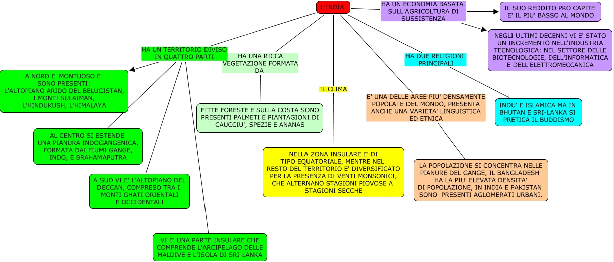 Questa Cmap, creata con IHMC CmapTools, contiene informazioni relative a: SUBCONTINENTE INDIANO, L'INDIA IL CLIMA NELLA ZONA INSULARE E' DI TIPO EQUATORIALE, MENTRE NEL RESTO DEL TERRITORIO E' DIVERSIFICATO PER LA PRESENZA DI VENTI MONSONICI, CHE ALTERNANO STAGIONI PIOVOSE A STAGIONI SECCHE, L'INDIA HA UN TERRITORIO DIVISO IN QUATTRO PARTI A SUD VI E' L'ALTOPIANO DEL DECCAN, COMPRESO TRA I MONTI GHATI ORIENTALI E OCCIDENTALI, L'INDIA E' UNA DELLE AREE PIU' DENSAMENTE POPOLATE DEL MONDO, PRESENTA ANCHE UNA VARIETA' LINGUISTICA ED ETNICA LA POPOLAZIONE SI CONCENTRA NELLE PIANURE DEL GANGE, IL BANGLADESH HA LA PIU' ELEVATA DENSITA' DI POPOLAZIONE, IN INDIA E PAKISTAN SONO PRESENTI AGLOMERATI URBANI., L'INDIA HA UNA RICCA VEGETAZIONE FORMATA DA FITTE FORESTE E SULLA COSTA SONO PRESENTI PALMETI E PIANTAGIONI DI CAUCCIU', SPEZIE E ANANAS, L'INDIA HA UN ECONOMIA BASATA SULL'AGRICOLTURA DI SUSSISTENZA NEGLI ULTIMI DECENNI VI E' STATO UN INCREMENTO NELL'INDUSTRIA TECNOLOGICA: NEL SETTORE DELLE BIOTECNOLOGIE, DELL'INFORMATICA E DELL'ELETTROMECCANICA, L'INDIA HA UN ECONOMIA BASATA SULL'AGRICOLTURA DI SUSSISTENZA IL SUO REDDITO PRO CAPITE E' IL PIU' BASSO AL MONDO, L'INDIA HA DUE RELIGIONI PRINCIPALI INDU' E ISLAMICA MA IN BHUTAN E SRI-LANKA SI PRETICA IL BUDDISMO, L'INDIA HA UN TERRITORIO DIVISO IN QUATTRO PARTI VI E' UNA PARTE INSULARE CHE COMPRENDE L'ARCIPELAGO DELLE MALDIVE E L'ISOLA DI SRI-LANKA, L'INDIA HA UN TERRITORIO DIVISO IN QUATTRO PARTI A NORD E' MONTUOSO E SONO PRESENTI: L'ALTOPIANO ARIDO DEL BELUCISTAN, I MONTI SULAIMAN, L'HINDUKUSH, L'HIMALAYA, L'INDIA HA UN TERRITORIO DIVISO IN QUATTRO PARTI AL CENTRO SI ESTENDE UNA PIANURA INDOGANGENICA, FORMATA DAI FIUMI GANGE, INDO, E BRAHAMAPUTRA