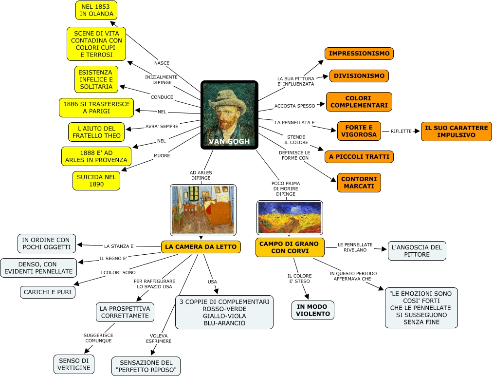 Questa Cmap, creata con IHMC CmapTools, contiene informazioni relative a: van gogh, LA PROSPETTIVA CORRETTAMETE SUGGERISCE COMUNQUE SENSO DI VERTIGINE, VAN GOGH NEL 1888 E' AD ARLES IN PROVENZA, LA CAMERA DA LETTO LA STANZA E' IN ORDINE CON POCHI OGGETTI, VAN GOGH AD ARLES DIPINGE LA CAMERA DA LETTO, VAN GOGH ACCOSTA SPESSO COLORI COMPLEMENTARI, VAN GOGH DEFINISCE LE FORME CON CONTORNI MARCATI, VAN GOGH LA PENNELLATA E' FORTE E VIGOROSA, LA CAMERA DA LETTO VOLEVA ESPRIMERE SENSAZIONE DEL "PERFETTO RIPOSO", VAN GOGH LA SUA PITTURA E' INFLUENZATA IMPRESSIONISMO, VAN GOGH AVRA' SEMPRE L'AIUTO DEL FRATELLO THEO, LA CAMERA DA LETTO PER RAFFIGURARE LO SPAZIO USA LA PROSPETTIVA CORRETTAMETE, VAN GOGH POCO PRIMA DI MORIRE DIPINGE CAMPO DI GRANO CON CORVI, LA CAMERA DA LETTO I COLORI SONO CARICHI E PURI, FORTE E VIGOROSA RIFLETTE IL SUO CARATTERE IMPULSIVO, CAMPO DI GRANO CON CORVI LE PENNELLATE RIVELANO L'ANGOSCIA DEL PITTORE, LA CAMERA DA LETTO IL SEGNO E' DENSO, CON EVIDENTI PENNELLATE, VAN GOGH MUORE SUICIDA NEL 1890, CAMPO DI GRANO CON CORVI IL COLORE E' STESO IN MODO VIOLENTO, LA CAMERA DA LETTO USA 3 COPPIE DI COMPLEMENTARI ROSSO-VERDE GIALLO-VIOLA BLU-ARANCIO, VAN GOGH NASCE NEL 1853 IN OLANDA
