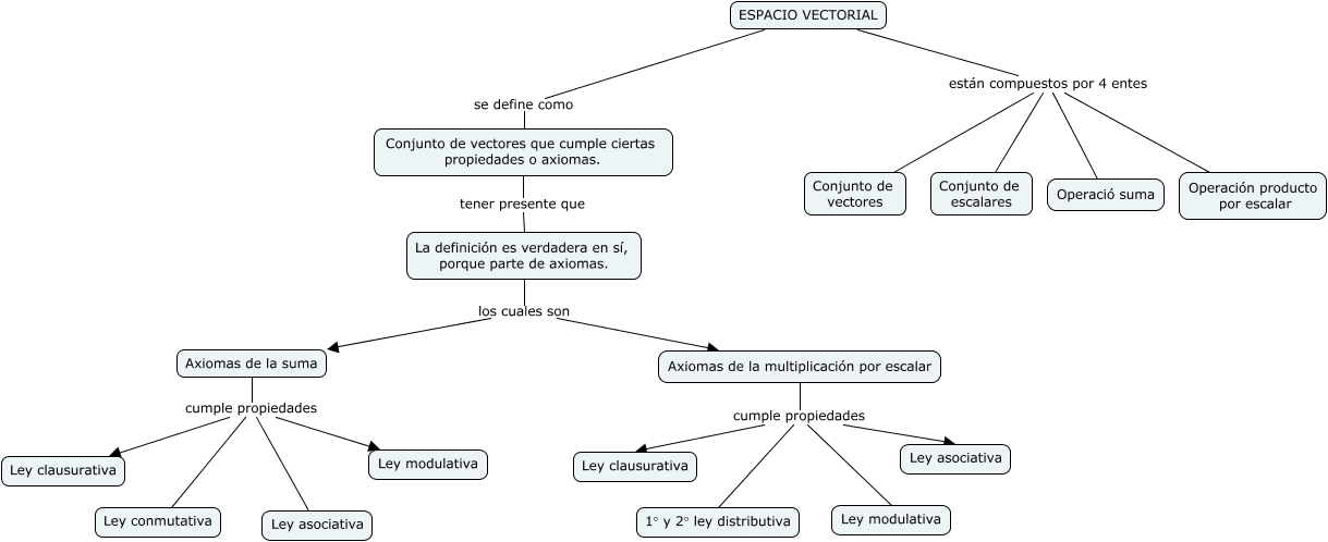 Este Cmap, tiene información relacionada con: espacio vectorial, ESPACIO VECTORIAL están compuestos por 4 entes Conjunto de escalares, La definición es verdadera en sí, porque parte de axiomas. los cuales son Axiomas de la suma, La definición es verdadera en sí, porque parte de axiomas. los cuales son Axiomas de la multiplicación por escalar, Axiomas de la suma cumple propiedades Ley clausurativa, Axiomas de la multiplicación por escalar cumple propiedades Ley clausurativa, ESPACIO VECTORIAL se define como Conjunto de vectores que cumple ciertas propiedades o axiomas., Axiomas de la multiplicación por escalar cumple propiedades Ley modulativa, Axiomas de la multiplicación por escalar cumple propiedades 1° y 2° ley distributiva, Conjunto de vectores que cumple ciertas propiedades o axiomas. tener presente que La definición es verdadera en sí, porque parte de axiomas., Axiomas de la multiplicación por escalar cumple propiedades Ley asociativa, ESPACIO VECTORIAL están compuestos por 4 entes Operació suma, ESPACIO VECTORIAL están compuestos por 4 entes Operación producto por escalar, Axiomas de la suma cumple propiedades Ley conmutativa, Axiomas de la suma cumple propiedades Ley asociativa, ESPACIO VECTORIAL están compuestos por 4 entes Conjunto de vectores, Axiomas de la suma cumple propiedades Ley modulativa