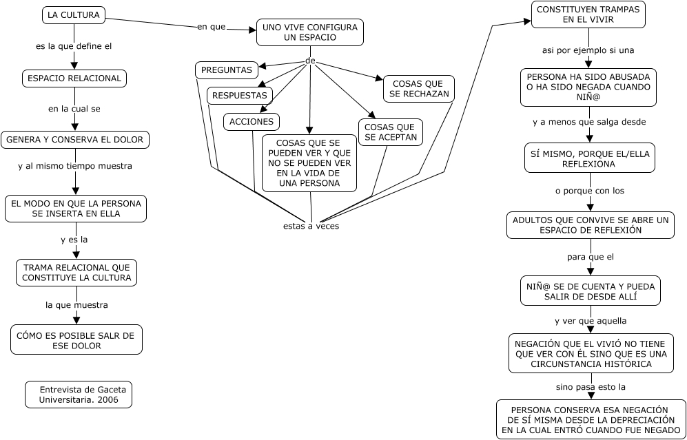 Este Cmap, tiene información relacionada con: La cultura y sus trampas, UNO VIVE CONFIGURA UN ESPACIO de COSAS QUE SE ACEPTAN, COSAS QUE SE RECHAZAN estas a veces CONSTITUYEN TRAMPAS EN EL VIVIR, LA CULTURA en que UNO VIVE CONFIGURA UN ESPACIO, UNO VIVE CONFIGURA UN ESPACIO de COSAS QUE SE RECHAZAN, ESPACIO RELACIONAL en la cual se GENERA Y CONSERVA EL DOLOR, CONSTITUYEN TRAMPAS EN EL VIVIR asi por ejemplo si una PERSONA HA SIDO ABUSADA O HA SIDO NEGADA CUANDO NIÑ@, UNO VIVE CONFIGURA UN ESPACIO de ACCIONES, COSAS QUE SE ACEPTAN estas a veces CONSTITUYEN TRAMPAS EN EL VIVIR, NIÑ@ SE DE CUENTA Y PUEDA SALIR DE DESDE ALLÍ y ver que aquella NEGACIÓN QUE EL VIVIÓ NO TIENE QUE VER CON ÉL SINO QUE ES UNA CIRCUNSTANCIA HISTÓRICA, PERSONA HA SIDO ABUSADA O HA SIDO NEGADA CUANDO NIÑ@ y a menos que salga desde SÍ MISMO, PORQUE EL/ELLA REFLEXIONA, GENERA Y CONSERVA EL DOLOR y al mismo tiempo muestra EL MODO EN QUE LA PERSONA SE INSERTA EN ELLA, UNO VIVE CONFIGURA UN ESPACIO de RESPUESTAS, EL MODO EN QUE LA PERSONA SE INSERTA EN ELLA y es la TRAMA RELACIONAL QUE CONSTITUYE LA CULTURA, COSAS QUE SE PUEDEN VER Y QUE NO SE PUEDEN VER EN LA VIDA DE UNA PERSONA estas a veces CONSTITUYEN TRAMPAS EN EL VIVIR, LA CULTURA es la que define el ESPACIO RELACIONAL, ACCIONES estas a veces CONSTITUYEN TRAMPAS EN EL VIVIR, UNO VIVE CONFIGURA UN ESPACIO de COSAS QUE SE PUEDEN VER Y QUE NO SE PUEDEN VER EN LA VIDA DE UNA PERSONA, PREGUNTAS estas a veces CONSTITUYEN TRAMPAS EN EL VIVIR, NEGACIÓN QUE EL VIVIÓ NO TIENE QUE VER CON ÉL SINO QUE ES UNA CIRCUNSTANCIA HISTÓRICA sino pasa esto la PERSONA CONSERVA ESA NEGACIÓN DE SÍ MISMA DESDE LA DEPRECIACIÓN EN LA CUAL ENTRÓ CUANDO FUE NEGADO, SÍ MISMO, PORQUE EL/ELLA REFLEXIONA o porque con los ADULTOS QUE CONVIVE SE ABRE UN ESPACIO DE REFLEXIÓN