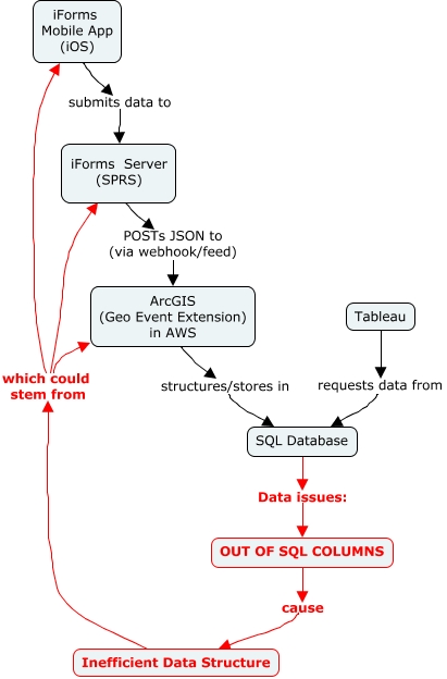 This Concept Map, created with IHMC CmapTools, has information related to: iForms, Inefficient Data Structure which could stem from ArcGIS (Geo Event Extension) in AWS, iForms Mobile App (iOS) submits data to iForms Server (SPRS), SQL Database Data issues: OUT OF SQL COLUMNS, Tableau requests data from SQL Database, Inefficient Data Structure which could stem from iForms Server (SPRS), Inefficient Data Structure which could stem from iForms Mobile App (iOS), OUT OF SQL COLUMNS cause Inefficient Data Structure, ArcGIS (Geo Event Extension) in AWS structures/stores in SQL Database, iForms Server (SPRS) POSTs JSON to (via webhook/feed) ArcGIS (Geo Event Extension) in AWS