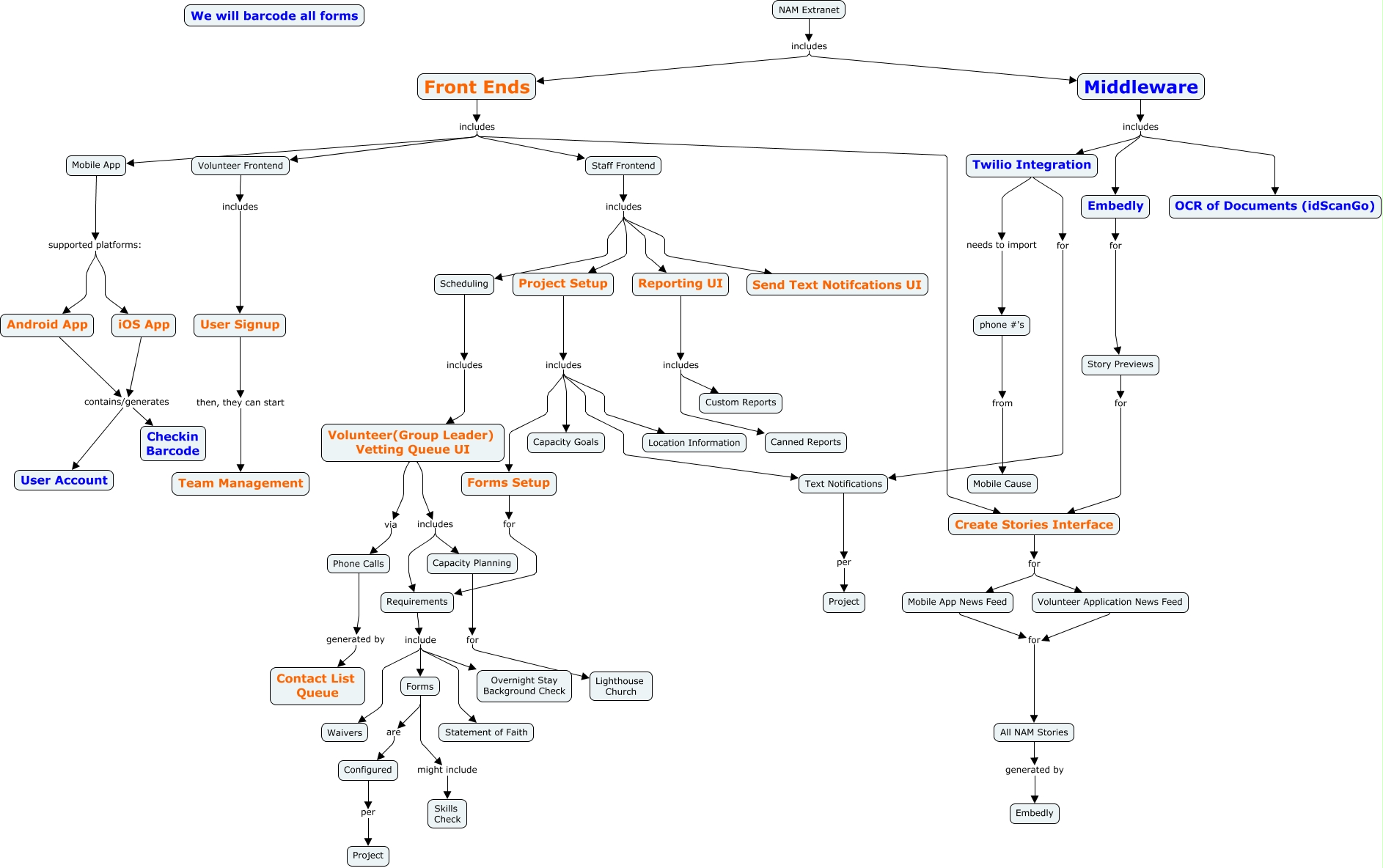 This Concept Map, created with IHMC CmapTools, has information related to: NAM Extranet, Front Ends includes Volunteer Frontend, Create Stories Interface for Volunteer Application News Feed, Phone Calls generated by Contact List Queue, Mobile App News Feed for All NAM Stories, Embedly for Story Previews, Middleware includes OCR of Documents (idScanGo), Configured per Project, Requirements include Statement of Faith, Front Ends includes Staff Frontend, Middleware includes Embedly, Front Ends includes Mobile App, Story Previews for Create Stories Interface, Requirements include Waivers, Forms Setup for Requirements, Forms are Configured, User Signup then, they can start Team Management, Android App contains/generates Checkin Barcode, Staff Frontend includes Reporting UI, Mobile App supported platforms: iOS App, Requirements include Overnight Stay Background Check