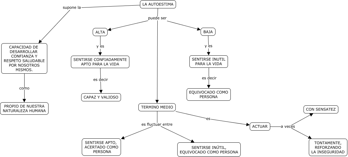 Este Cmap, tiene información relacionada con: Tipos de autoestima, SENTIRSE INUTIL PARA LA VIDA es decir EQUIVOCADO COMO PERSONA, TERMINO MEDIO es ACTUAR, LA AUTOESTIMA puede ser TERMINO MEDIO, ALTA y es SENTIRSE CONFIADAMENTE APTO PARA LA VIDA, LA AUTOESTIMA supone la CAPACIDAD DE DESARROLLAR CONFIANZA Y RESPETO SALUDABLE POR NOSOTROS MISMOS., SENTIRSE CONFIADAMENTE APTO PARA LA VIDA es decir CAPAZ Y VALIOSO, BAJA y es SENTIRSE INUTIL PARA LA VIDA, ACTUAR a veces CON SENSATEZ, TERMINO MEDIO es fluctuar entre SENTIRSE APTO, ACERTADO COMO PERSONA, TERMINO MEDIO es fluctuar entre SENTIRSE INÚTIL, EQUIVOCADO COMO PERSONA, ACTUAR a veces TONTAMENTE, REFORZANDO LA INSEGURIDAD, LA AUTOESTIMA puede ser ALTA, CAPACIDAD DE DESARROLLAR CONFIANZA Y RESPETO SALUDABLE POR NOSOTROS MISMOS. como PROPIO DE NUESTRA NATURALEZA HUMANA, LA AUTOESTIMA puede ser BAJA