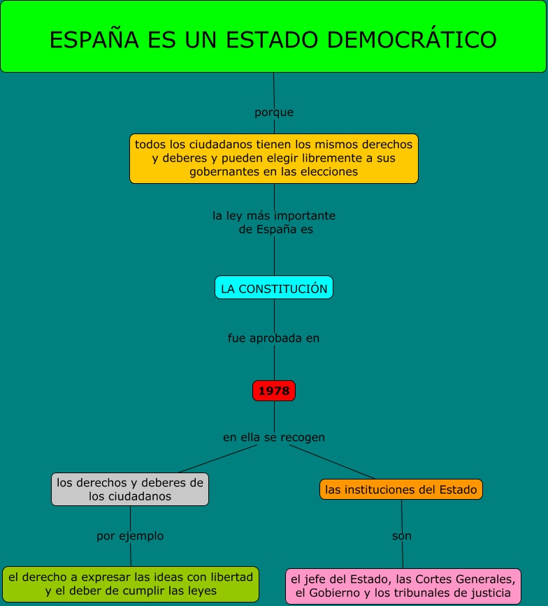 Este Cmap, tiene información relacionada con: España es un Estado democrático, ESPAÑA ES UN ESTADO DEMOCRÁTICO porque todos los ciudadanos tienen los mismos derechos y deberes y pueden elegir libremente a sus gobernantes en las elecciones, las instituciones del Estado son el jefe del Estado, las Cortes Generales, el Gobierno y los tribunales de justicia, 1978 en ella se recogen las instituciones del Estado, 1978 en ella se recogen los derechos y deberes de los ciudadanos, todos los ciudadanos tienen los mismos derechos y deberes y pueden elegir libremente a sus gobernantes en las elecciones la ley más importante de España es LA CONSTITUCIÓN, los derechos y deberes de los ciudadanos por ejemplo el derecho a expresar las ideas con libertad y el deber de cumplir las leyes, LA CONSTITUCIÓN fue aprobada en 1978