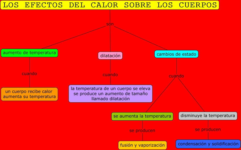 Este Cmap, tiene información relacionada con: Los efectos del calor sobre los cuerpos, LOS EFECTOS DEL CALOR SOBRE LOS CUERPOS son cambios de estado, cambios de estado cuando disminuye la temperatura, cambios de estado cuando se aumenta la temperatura, dilatación cuando la temperatura de un cuerpo se eleva se produce un aumento de tamaño llamado dilatación, LOS EFECTOS DEL CALOR SOBRE LOS CUERPOS son aumento de temperatura, disminuye la temperatura se producen condensación y solidificación, aumento de temperatura cuando un cuerpo recibe calor aumenta su temperatura, LOS EFECTOS DEL CALOR SOBRE LOS CUERPOS son dilatación, se aumenta la temperatura se producen fusión y vaporización