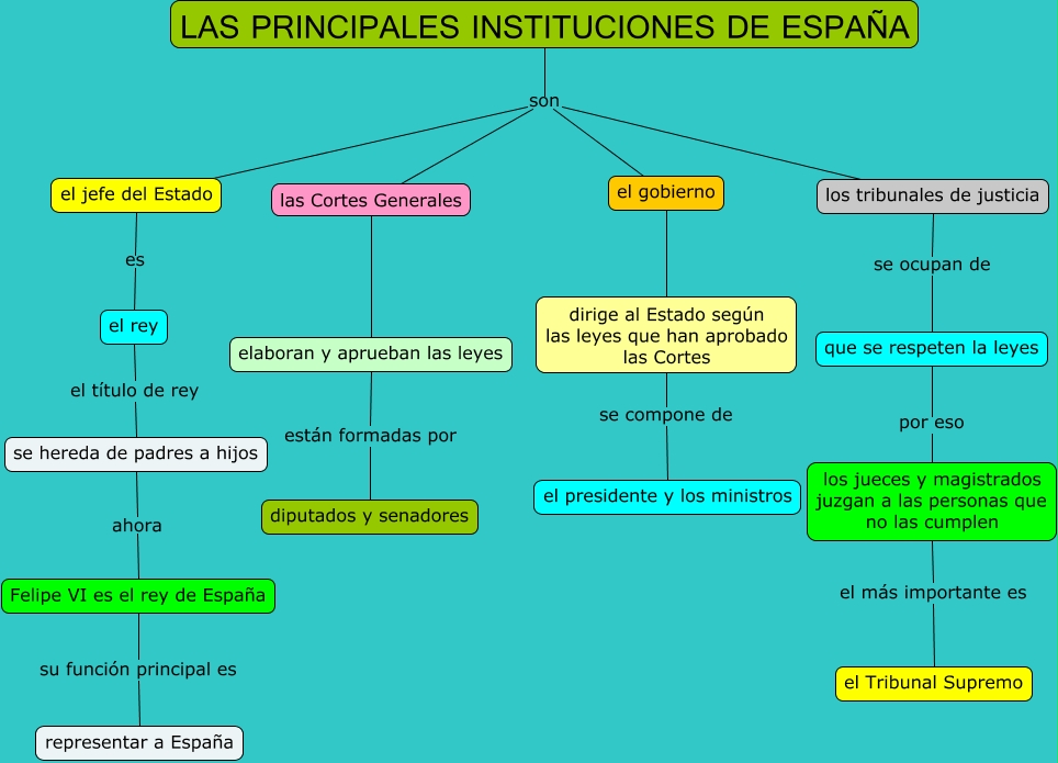 Este Cmap, tiene información relacionada con: LAS PRINCIPALES INSTITUCIONES DE ESPAÑA, LAS PRINCIPALES INSTITUCIONES DE ESPAÑA son el jefe del Estado, Felipe VI es el rey de España su función principal es representar a España, el jefe del Estado es el rey, elaboran y aprueban las leyes están formadas por diputados y senadores, dirige al Estado según las leyes que han aprobado las Cortes se compone de el presidente y los ministros, los jueces y magistrados juzgan a las personas que no las cumplen el más importante es el Tribunal Supremo, el gobierno dirige al Estado según las leyes que han aprobado las Cortes, las Cortes Generales elaboran y aprueban las leyes, el rey el título de rey se hereda de padres a hijos, los tribunales de justicia se ocupan de que se respeten la leyes, LAS PRINCIPALES INSTITUCIONES DE ESPAÑA son el gobierno, que se respeten la leyes por eso los jueces y magistrados juzgan a las personas que no las cumplen, LAS PRINCIPALES INSTITUCIONES DE ESPAÑA son los tribunales de justicia, se hereda de padres a hijos ahora Felipe VI es el rey de España, LAS PRINCIPALES INSTITUCIONES DE ESPAÑA son las Cortes Generales