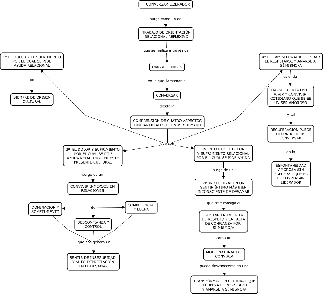 Este Cmap, tiene información relacionada con: Conversar liberador, DESCONFIANZA Y CONTROL que nos genera un SENTIR DE INSEGURIDAD Y AUTO-DEPRECIACIÓN EN EL DESAMAR, DOMINACIÓN Y SOMETIMIENTO que nos genera un SENTIR DE INSEGURIDAD Y AUTO-DEPRECIACIÓN EN EL DESAMAR, COMPRENSIÓN DE CUATRO ASPECTOS FUNDAMENTALES DEL VIVIR HUMANO que son 1º EL DOLOR Y EL SUFRIMIENTO POR EL CUAL SE PIDE AYUDA RELACIONAL, DANZAR JUNTOS en lo que llamamos el CONVERSAR, CONVERSAR LIBERADOR surge como un de TRABAJO DE ORIENTACIÓN RELACIONAL REFLEXIVO, HABITAR EN LA FALTA DE RESPETO Y LA FALTA DE CONFIANZA POR SÍ MISMO/A como un MODO NATURAL DE CONVIVIR, CONVIVIR INMERSOS EN RELACIONES de DESCONFIANZA Y CONTROL, COMPRENSIÓN DE CUATRO ASPECTOS FUNDAMENTALES DEL VIVIR HUMANO que son 3º EN TANTO EL DOLOR Y SUFRIMIENTO RELACIONAL POR EL CUAL SE PIDE AYUDA, RECUPERACIÓN PUEDE OCURRIR EN UN CONVERSAR en la ESPONTANEIDAD AMOROSA SIN ESFUERZO QUE ES EL CONVERSAR LIBERADOR, CONVIVIR INMERSOS EN RELACIONES de DOMINACIÓN Y SOMETIMIENTO, 4º EL CAMINO PARA RECUPERAR EL RESPETARSE Y AMARSE A SÍ MISMO/A es el de DARSE CUENTA EN EL VIVIR Y CONVIVIR COTIDIANO QUE SE ES UN SER AMOROSO, COMPRENSIÓN DE CUATRO ASPECTOS FUNDAMENTALES DEL VIVIR HUMANO que son 2º EL DOLOR Y SUFRIMIENTO POR EL CUAL SE PIDE AYUDA RELACIONAL EN ESTE PRESENTE CULTURAL, TRABAJO DE ORIENTACIÓN RELACIONAL REFLEXIVO que se realiza a través del DANZAR JUNTOS, COMPETENCIA Y LUCHA que nos genera un SENTIR DE INSEGURIDAD Y AUTO-DEPRECIACIÓN EN EL DESAMAR, VIVIR CULTURAL EN UN SENTIR ÍNTIMO MÁS BIEN INCONSCIENTE DE DESAMAR que trae consigo el HABITAR EN LA FALTA DE RESPETO Y LA FALTA DE CONFIANZA POR SÍ MISMO/A, CONVIVIR INMERSOS EN RELACIONES de COMPETENCIA Y LUCHA, 2º EL DOLOR Y SUFRIMIENTO POR EL CUAL SE PIDE AYUDA RELACIONAL EN ESTE PRESENTE CULTURAL surge de un CONVIVIR INMERSOS EN RELACIONES, DARSE CUENTA EN EL VIVIR Y CONVIVIR COTIDIANO QUE SE ES UN SER AMOROSO y tal RECUPERACIÓN PUEDE OCURRIR EN UN CONVERSAR, CONVERSAR desde la COMPRENSIÓN DE CUATRO ASPECTOS FUNDAMENTALES DEL VIVIR HUMANO, 3º EN TANTO EL DOLOR Y SUFRIMIENTO RELACIONAL POR EL CUAL SE PIDE AYUDA surge de un VIVIR CULTURAL EN UN SENTIR ÍNTIMO MÁS BIEN INCONSCIENTE DE DESAMAR