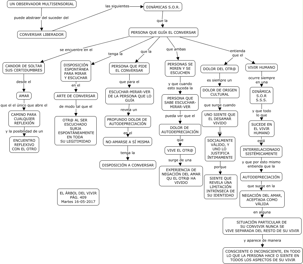 Este Cmap, tiene información relacionada con: CONVERSACIONES LIBERADORAS, DOLOR DEL OTR@ es siempre un DOLOR DE ORIGEN CULTURAL, CANDOR DE SOLTAR SUS CERTIDUMBRES desde el AMAR, PERSONA QUE GUÍA EL CONVERSAR tenga la DISPOSICIÓN ESPONTÁNEA PARA MIRAR Y ESCUCHAR, SUCEDE EN EL VIVIR HUMANO está INTERRELACIONADO SISTÉMICAMENTE, ARTE DE CONVERSAR de modo tal que el OTR@ AL SER ESCUCHADO SURJA ESPONTÁNEAMENTE EN TODA SU LEGITIMIDAD, DOLOR DE AUTODEPRECIACIÓN que VIVE EL OTR@, SOCIALMENTE VÁLIDO, Y UNO LO JUSTIFICA ÍNTIMAMENTE porque SIENTE QUE REVELA UNA LIMITACIÓN INTRÍNSECA DE SU IDENTIDAD, ESCUCHAR-MIRAR-VER DE LA PERSONA QUE LO GUÍA revela un PROFUNDO DOLOR DE AUTODEPRECIACIÓN, VIVE EL OTR@ surge de una EXPERIENCIA DE NEGACIÓN DEL AMAR QU EL OTR@ HA VIVIDO, CONVERSAR LIBERADOR las siguientes DINÁMICAS S.O.R., PERSONAS SE MIREN Y SE ESCUCHEN y que cuando esto suceda la PERSONA QUE SABE ESCUCHAR- MIRAR-VER, PROFUNDO DOLOR DE AUTODEPRECIACIÓN en el NO-AMARSE A SÍ MISMA, INTERRELACIONADO SISTÉMICAMENTE y que por esto mismo entienda que la AUTODEPRECIACIÓN, PERSONA QUE GUÍA EL CONVERSAR entienda que el VIVIR HUMANO, NEGACIÓN DEL AMAR, ACEPTADA COMO VÁLIDA en alguna SITUACIÓN PARTICULAR DE SU CONVIVIR NUNCA SE VIVE SEPARADA DEL RESTO DE SU VIVIR, PERSONA QUE GUÍA EL CONVERSAR que la PERSONA QUE PIDE EL CONVERSAR, VIVIR HUMANO ocurre siempre en una DINÁMICA S.O.R S.S.S., UN OBSERVADOR MULTISENSORIAL puede abstraer del suceder del CONVERSAR LIBERADOR, NO-AMARSE A SÍ MISMA tenga la DISPOSICIÓN A CONVERSAR, AMAR que el el único que abre el CAMINO PARA CUALQUIER REFLEXIÓN