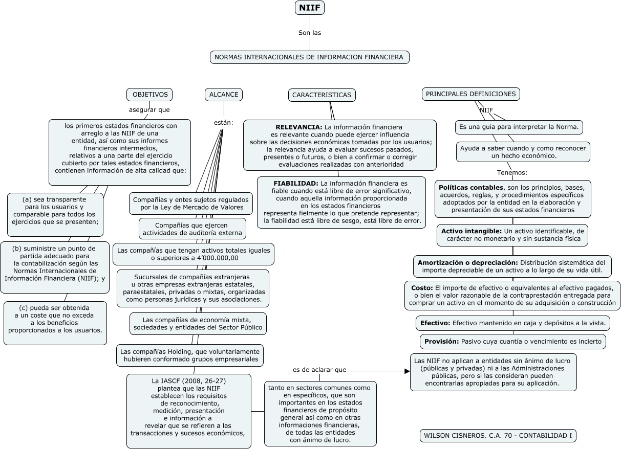 Este Cmap, tiene información relacionada con: NIIF 1, ALCANCE están: Las compañías que tengan activos totales iguales o superiores a 4’000.000,00, tanto en sectores comunes como en específicos, que son importantes en los estados financieros de propósito general así como en otras informaciones financieras, de todas las entidades con ánimo de lucro. es de aclarar que Las NIIF no aplican a entidades sin ánimo de lucro (públicas y privadas) ni a las Administraciones públicas, pero si las consideran pueden encontrarlas apropiadas para su aplicación., ALCANCE están: Las compañías Holding, que voluntariamente hubieren conformado grupos empresariales, los primeros estados financieros con arreglo a las NIIF de una entidad, así como sus informes financieros intermedios, relativos a una parte del ejercicio cubierto por tales estados financieros, contienen información de alta calidad que: ???? (a) sea transparente para los usuarios y comparable para todos los ejercicios que se presenten;, los primeros estados financieros con arreglo a las NIIF de una entidad, así como sus informes financieros intermedios, relativos a una parte del ejercicio cubierto por tales estados financieros, contienen información de alta calidad que: ???? (c) pueda ser obtenida a un coste que no exceda a los beneficios proporcionados a los usuarios., ALCANCE están: Las compañías de economía mixta, sociedades y entidades del Sector Público, RELEVANCIA: La información financiera es relevante cuando puede ejercer influencia sobre las decisiones económicas tomadas por los usuarios; la relevancia ayuda a evaluar sucesos pasados, presentes o futuros, o bien a confirmar o corregir evaluaciones realizadas con anterioridad ???? FIABILIDAD: La información financiera es fiable cuando está libre de error significativo, cuando aquella información proporcionada en los estados financieros representa fielmente lo que pretende representar; la fiabilidad está libre de sesgo, está libre de error., OBJETIVOS asegurar que los primeros estados financieros con arreglo a las NIIF de una entidad, así como sus informes financieros intermedios, relativos a una parte del ejercicio cubierto por tales estados financieros, contienen información de alta calidad que:, PRINCIPALES DEFINICIONES NIIF Es una guia para interpretar la Norma., los primeros estados financieros con arreglo a las NIIF de una entidad, así como sus informes financieros intermedios, relativos a una parte del ejercicio cubierto por tales estados financieros, contienen información de alta calidad que: ???? (b) suministre un punto de partida adecuado para la contabilización según las Normas Internacionales de Información Financiera (NIIF); y, NIIF Son las NORMAS INTERNACIONALES DE INFORMACION FINANCIERA, PRINCIPALES DEFINICIONES Tenemos: Políticas contables, son los principios, bases, acuerdos, reglas, y procedimientos específicos adoptados por la entidad en la elaboración y presentación de sus estados financieros, PRINCIPALES DEFINICIONES Tenemos: Activo intangible: Un activo identificable, de carácter no monetario y sin sustancia física, La IASCF (2008, 26-27) plantea que las NIIF establecen los requisitos de reconocimiento, medición, presentación e información a revelar que se refieren a las transacciones y sucesos económicos, ???? tanto en sectores comunes como en específicos, que son importantes en los estados financieros de propósito general así como en otras informaciones financieras, de todas las entidades con ánimo de lucro., ALCANCE están: Compañías que ejercen actividades de auditoría externa, PRINCIPALES DEFINICIONES NIIF Ayuda a saber cuando y como reconocer un hecho económico., PRINCIPALES DEFINICIONES Tenemos: Provisión: Pasivo cuya cuantía o vencimiento es incierto, CARACTERISTICAS ???? RELEVANCIA: La información financiera es relevante cuando puede ejercer influencia sobre las decisiones económicas tomadas por los usuarios; la relevancia ayuda a evaluar sucesos pasados, presentes o futuros, o bien a confirmar o corregir evaluaciones realizadas con anterioridad, PRINCIPALES DEFINICIONES Tenemos: Costo: El importe de efectivo o equivalentes al efectivo pagados, o bien el valor razonable de la contraprestación entregada para comprar un activo en el momento de su adquisición o construcción, ALCANCE están: La IASCF (2008, 26-27) plantea que las NIIF establecen los requisitos de reconocimiento, medición, presentación e información a revelar que se refieren a las transacciones y sucesos económicos,