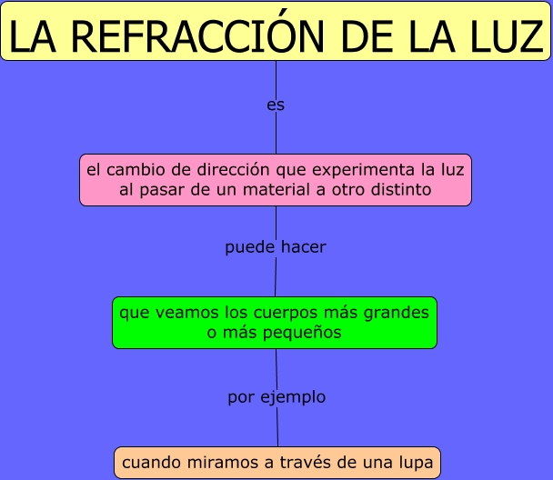 Este Cmap, tiene información relacionada con: La refracción de la luz, el cambio de dirección que experimenta la luz al pasar de un material a otro distinto puede hacer que veamos los cuerpos más grandes o más pequeños, LA REFRACCIÓN DE LA LUZ es el cambio de dirección que experimenta la luz al pasar de un material a otro distinto, que veamos los cuerpos más grandes o más pequeños por ejemplo cuando miramos a través de una lupa