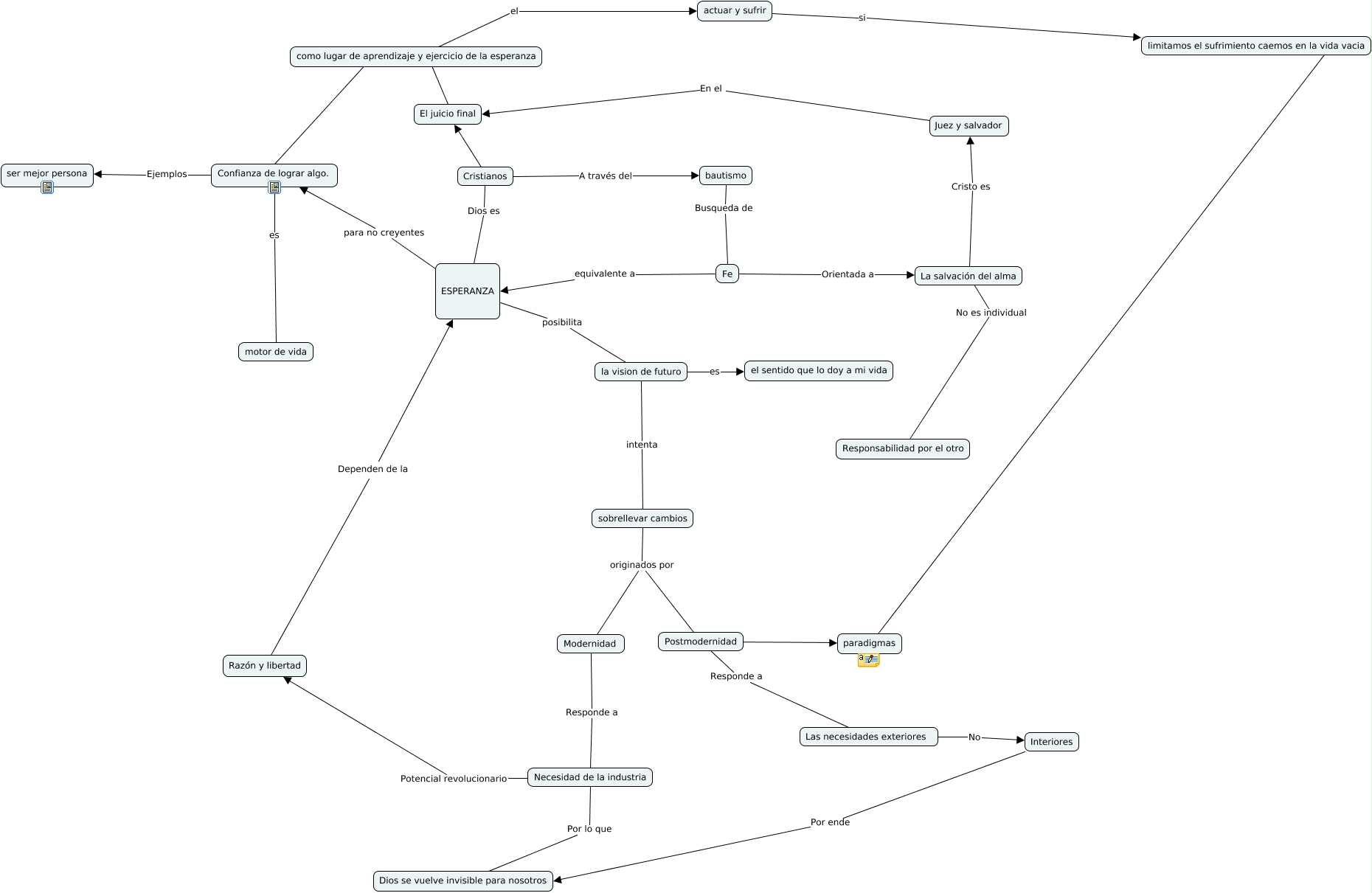 Este Cmap, tiene información relacionada con: esperanza, sobrellevar cambios originados por Postmodernidad, limitamos el sufrimiento caemos en la vida vacia ???? paradigmas, Modernidad Responde a Necesidad de la industria, Confianza de lograr algo. es motor de vida, Cristianos ???? El juicio final, ESPERANZA posibilita la vision de futuro, Fe Orientada a La salvación del alma, ESPERANZA para no creyentes Confianza de lograr algo., Necesidad de la industria Potencial revolucionario Razón y libertad, como lugar de aprendizaje y ejercicio de la esperanza el actuar y sufrir, bautismo Busqueda de Fe, Interiores Por ende Dios se vuelve invisible para nosotros, Confianza de lograr algo. Ejemplos ser mejor persona, Fe equivalente a ESPERANZA, Razón y libertad Dependen de la ESPERANZA, como lugar de aprendizaje y ejercicio de la esperanza ???? Confianza de lograr algo., la vision de futuro es el sentido que lo doy a mi vida, La salvación del alma Cristo es Juez y salvador, La salvación del alma No es individual Responsabilidad por el otro, como lugar de aprendizaje y ejercicio de la esperanza ???? El juicio final