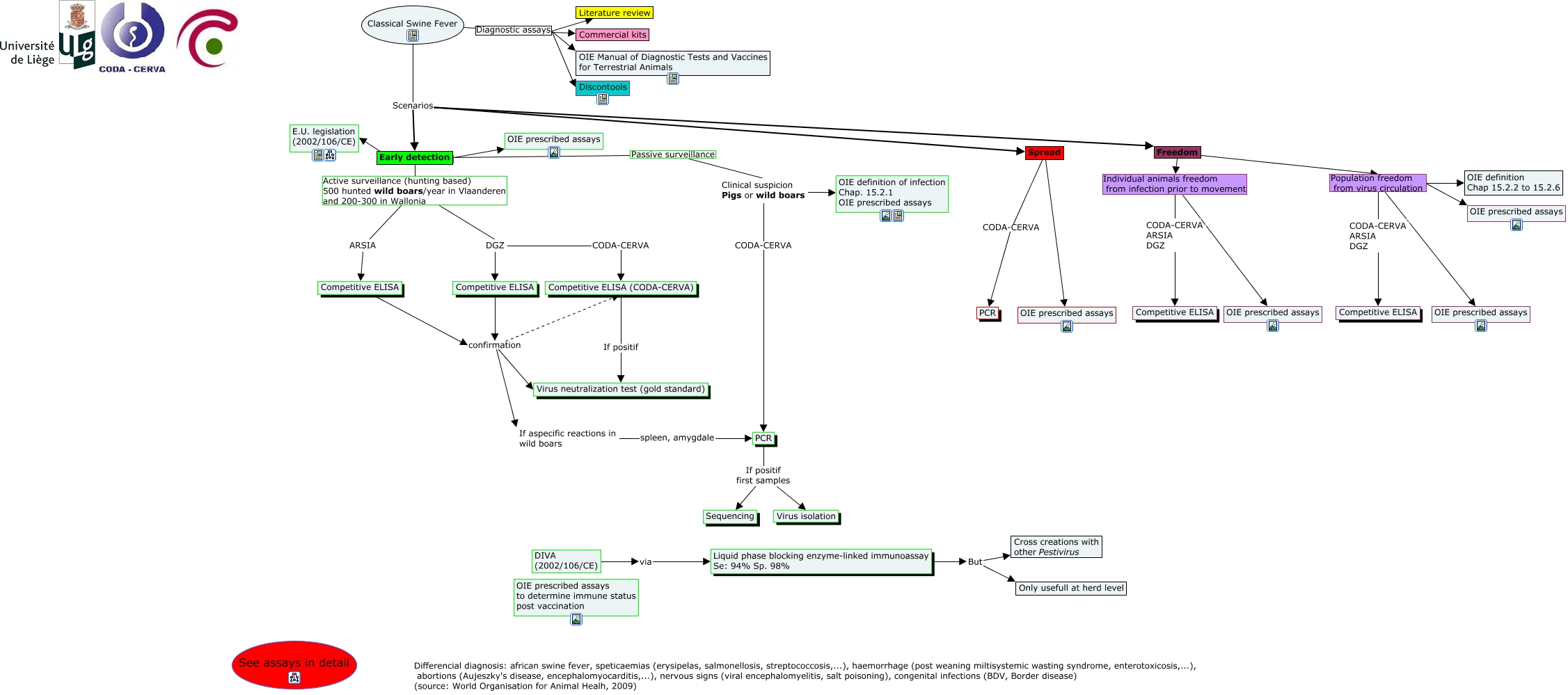This Concept Map, created with IHMC CmapTools, has information related to: Classical swine fever VF, Early detection Passive surveillance Clinical suspicion Pigs or wild boars, Classical Swine Fever Diagnostic assays OIE Manual of Diagnostic Tests and Vaccines for Terrestrial Animals, Clinical suspicion Pigs or wild boars CODA-CERVA PCR, Competitive ELISA confirmation Competitive ELISA (CODA-CERVA), Competitive ELISA confirmation Virus neutralization test (gold standard), Classical Swine Fever Diagnostic assays Commercial kits, Classical Swine Fever Scenarios Spread, Early detection Active surveillance (hunting based) 500 hunted wild boars/year in Vlaanderen and 200-300 in Wallonia ARSIA, Freedom Population freedom from virus circulation OIE prescribed assays, Competitive ELISA confirmation Virus neutralization test (gold standard), DIVA (2002/106/CE) via Liquid phase blocking enzyme-linked immunoassay Se: 94% Sp. 98%, Liquid phase blocking enzyme-linked immunoassay Se: 94% Sp. 98% But Only usefull at herd level, DGZ CODA-CERVA Competitive ELISA (CODA-CERVA), Competitive ELISA confirmation If aspecific reactions in wild boars, Liquid phase blocking enzyme-linked immunoassay Se: 94% Sp. 98% But Cross creations with other Pestivirus, Classical Swine Fever Diagnostic assays Discontools, Competitive ELISA (CODA-CERVA) If positif Virus neutralization test (gold standard), Early detection Active surveillance (hunting based) 500 hunted wild boars/year in Vlaanderen and 200-300 in Wallonia DGZ, Spread ???? OIE prescribed assays, CODA-CERVA ARSIA DGZ ???? Competitive ELISA