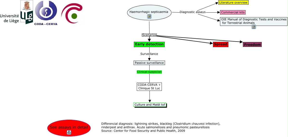 This Concept Map, created with IHMC CmapTools, has information related to: Haemorrhagic septicaemia, Early detection Surveillance Passive surveillance, Passive surveillance Clinical suspicion Culture and Maldi tof, Haemorrhagic septicaemia Scenarios Freedom, Haemorrhagic septicaemia Scenarios Early detection, Haemorrhagic septicaemia Diagnostic assays OIE Manual of Diagnostic Tests and Vaccines for Terrestrial Animals, Haemorrhagic septicaemia Diagnostic assays Literature overview, Haemorrhagic septicaemia Diagnostic assays Commercial kits, Haemorrhagic septicaemia Scenarios Spread