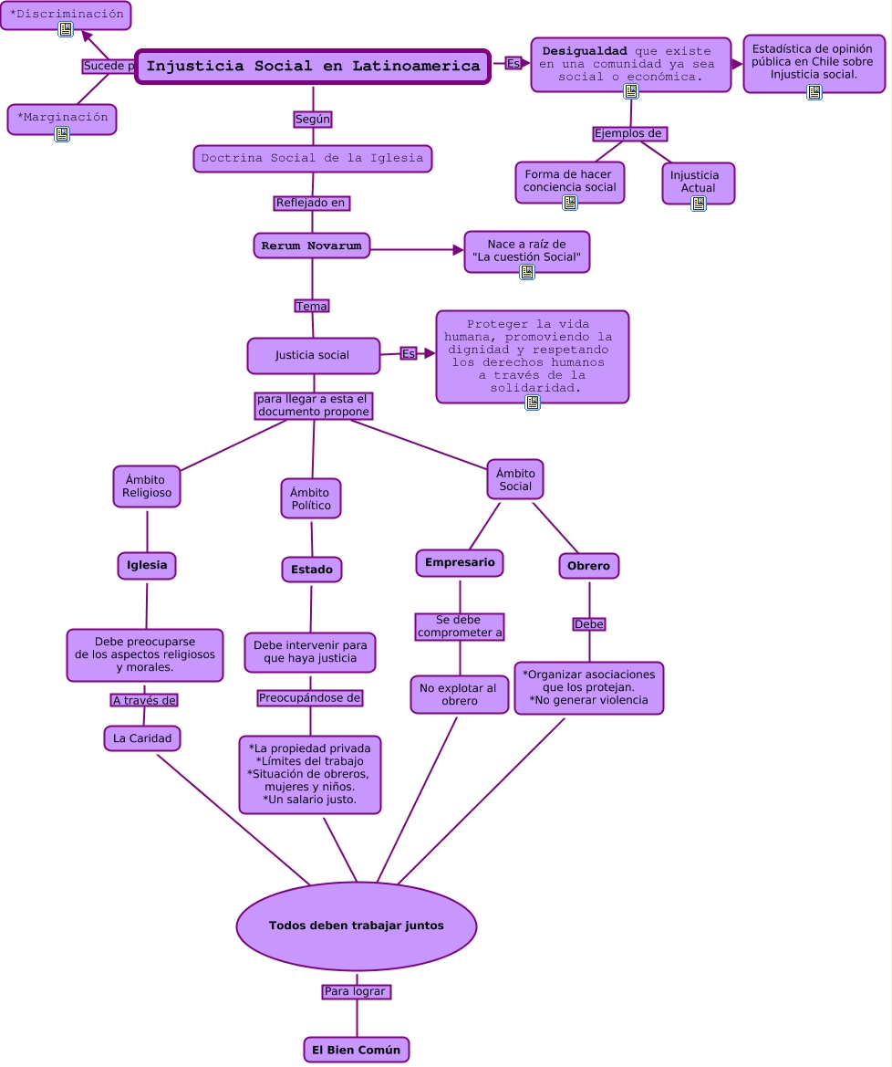 Este Cmap, tiene información relacionada con: Cultura1.cmap, Desigualdad que existe en una comunidad ya sea social o económica. ???? Estadística de opinión pública en Chile sobre Injusticia social., Iglesia ???? Debe preocuparse de los aspectos religiosos y morales., Rerum Novarum Tema Justicia social, Ámbito Político ???? Estado, Injusticia Social en Latinoamerica Sucede por *Marginación, *La propiedad privada *Límites del trabajo *Situación de obreros, mujeres y niños. *Un salario justo. ???? Todos deben trabajar juntos, Doctrina Social de la Iglesia Reflejado en Rerum Novarum, Injusticia Social en Latinoamerica Según Doctrina Social de la Iglesia, Debe intervenir para que haya justicia Preocupándose de *La propiedad privada *Límites del trabajo *Situación de obreros, mujeres y niños. *Un salario justo., No explotar al obrero ???? Todos deben trabajar juntos, Debe preocuparse de los aspectos religiosos y morales. A través de La Caridad, Empresario Se debe comprometer a No explotar al obrero, Injusticia Social en Latinoamerica Es Desigualdad que existe en una comunidad ya sea social o económica., Justicia social Es Proteger la vida humana, promoviendo la dignidad y respetando los derechos humanos a través de la solidaridad., Desigualdad que existe en una comunidad ya sea social o económica. Ejemplos de Injusticia Actual, La Caridad ???? Todos deben trabajar juntos, Todos deben trabajar juntos Para lograr El Bien Común, Estado ???? Debe intervenir para que haya justicia, *Organizar asociaciones que los protejan. *No generar violencia ???? Todos deben trabajar juntos, Obrero Debe *Organizar asociaciones que los protejan. *No generar violencia