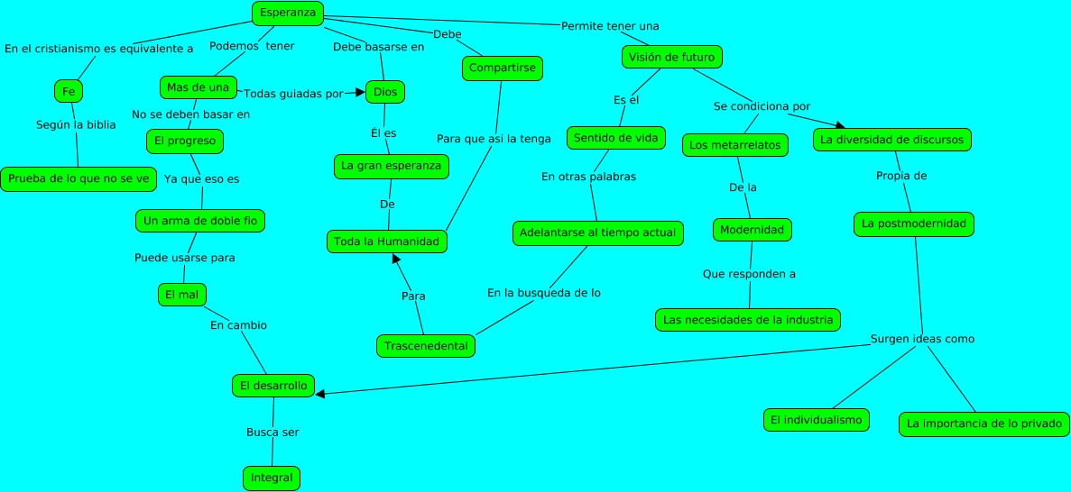 Este Cmap, tiene información relacionada con: Cultura.cmap, Dios Él es La gran esperanza, La diversidad de discursos Propia de La postmodernidad, Esperanza Podemos tener Mas de una, El progreso Ya que eso es Un arma de doble fio, Visión de futuro Es el Sentido de vida, Visión de futuro Se condiciona por Los metarrelatos, La postmodernidad Surgen ideas como El individualismo, Adelantarse al tiempo actual En la busqueda de lo Trascenedental, Mas de una Todas guiadas por Dios, Trascenedental Para Toda la Humanidad, Compartirse Para que asi la tenga Toda la Humanidad, Esperanza Debe basarse en Dios, Fe Según la biblia Prueba de lo que no se ve, La postmodernidad Surgen ideas como El desarrollo, La postmodernidad Surgen ideas como La importancia de lo privado, Un arma de doble fio Puede usarse para El mal, La gran esperanza De Toda la Humanidad, El desarrollo Busca ser Integral, Mas de una No se deben basar en El progreso, Esperanza En el cristianismo es equivalente a Fe