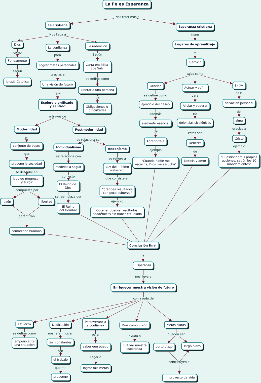 Este Cmap, tiene información relacionada con: La Esperanza de Aguayo y Barraza, Explora significado y sentido a través de Modernidad, ejercicio del deseo además elemento esencial, idea de progresar y surgir compuesta por razón, Esperanza cristiana tiene Lugares de aprendizaje, Aliviar y superar las dolencias sicológicas, comodidad humana ???? Conclusión final, "Cuestionar mis propias acciones, según los 10 mandamientos" ???? Conclusión final, Metas claras pueden ser largo plazo, justicia y amor ???? Conclusión final, Actuar y sufrir para Aliviar y superar, razón garantizan comodidad humana, Lugares de aprendizaje Y Ejercicio, Perseverancia y confianza para saber que puedo, Ejercicio tales como Oración, saber que puedo llegar a lograr mis metas, Individualismo se relaciona con modelos a seguir, Postmodernidad se relaciona con Hedonísmo, Enriquecer nuestra visión de futuro con ayuda de Dedicación, Fe cristiana Nos lleva a La confianza, Aprendizaje ejemplo "Cuando nadie me escucha, Dios me escucha"