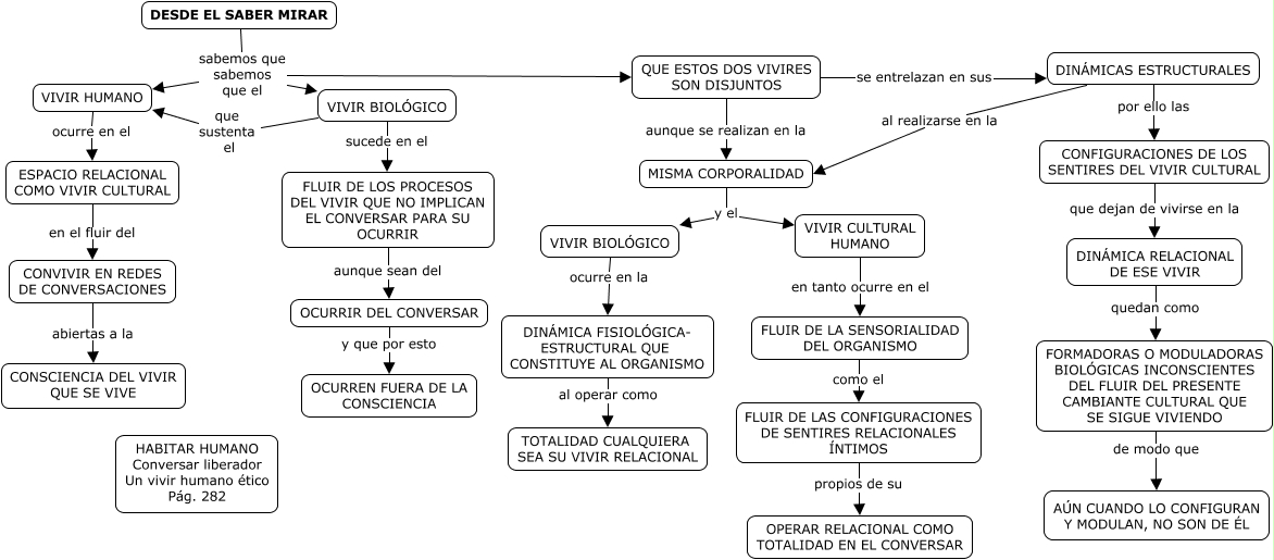 Este Cmap, tiene información relacionada con: Conversaciones Liberadoras desde el Saber Mirar, ESPACIO RELACIONAL COMO VIVIR CULTURAL en el fluir del CONVIVIR EN REDES DE CONVERSACIONES, VIVIR CULTURAL HUMANO en tanto ocurre en el FLUIR DE LA SENSORIALIDAD DEL ORGANISMO, DESDE EL SABER MIRAR sabemos que sabemos que el VIVIR BIOLÓGICO, OCURRIR DEL CONVERSAR y que por esto OCURREN FUERA DE LA CONSCIENCIA, CONVIVIR EN REDES DE CONVERSACIONES abiertas a la CONSCIENCIA DEL VIVIR QUE SE VIVE, DINÁMICAS ESTRUCTURALES por ello las CONFIGURACIONES DE LOS SENTIRES DEL VIVIR CULTURAL, DESDE EL SABER MIRAR sabemos que sabemos que el QUE ESTOS DOS VIVIRES SON DISJUNTOS, MISMA CORPORALIDAD y el VIVIR CULTURAL HUMANO, QUE ESTOS DOS VIVIRES SON DISJUNTOS se entrelazan en sus DINÁMICAS ESTRUCTURALES, QUE ESTOS DOS VIVIRES SON DISJUNTOS aunque se realizan en la MISMA CORPORALIDAD, FLUIR DE LOS PROCESOS DEL VIVIR QUE NO IMPLICAN EL CONVERSAR PARA SU OCURRIR aunque sean del OCURRIR DEL CONVERSAR, VIVIR BIOLÓGICO que sustenta el VIVIR HUMANO, DINÁMICAS ESTRUCTURALES al realizarse en la MISMA CORPORALIDAD, CONFIGURACIONES DE LOS SENTIRES DEL VIVIR CULTURAL que dejan de vivirse en la DINÁMICA RELACIONAL DE ESE VIVIR, VIVIR BIOLÓGICO ocurre en la DINÁMICA FISIOLÓGICA- ESTRUCTURAL QUE CONSTITUYE AL ORGANISMO, DESDE EL SABER MIRAR sabemos que sabemos que el VIVIR HUMANO, VIVIR BIOLÓGICO sucede en el FLUIR DE LOS PROCESOS DEL VIVIR QUE NO IMPLICAN EL CONVERSAR PARA SU OCURRIR, FLUIR DE LA SENSORIALIDAD DEL ORGANISMO como el FLUIR DE LAS CONFIGURACIONES DE SENTIRES RELACIONALES ÍNTIMOS, DINÁMICA FISIOLÓGICA- ESTRUCTURAL QUE CONSTITUYE AL ORGANISMO al operar como TOTALIDAD CUALQUIERA SEA SU VIVIR RELACIONAL, MISMA CORPORALIDAD y el VIVIR BIOLÓGICO